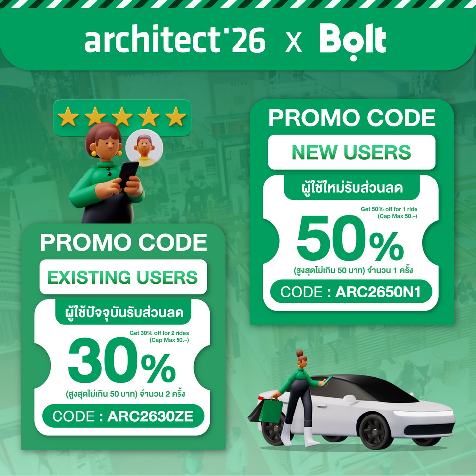 งานสถาปนิก’69 เตรียมมอบสิทธิพิเศษสำหรับผู้เข้าชมงานทั้งด้านการเดินทางและที่พัก เพื่ออำนวยความสะดวกให้ผู้เข้าร่วมงานได้เดินทางและพักผ่อนอย่างสะดวกสบายตลอดช่วงการจัดงาน โดยปีนี้ผู้จัดงานได้ร่วมมือกับพันธมิตรด้านบริการเดินทางและที่พัก ได้แก่ LINE MAN RIDE, Bolt และ TK Palace Hotel & Convention สำหรับ LINE MAN RIDE มอบส่วนลดค่าโดยสาร 20% สำหรับบริการ Eco และ Bike เพียงใส่โค้ด ARCRIDE50 รับส่วนลดสูงสุด 50 บาท จำนวน 2 ครั้งต่อผู้ใช้ ขณะเดียวกัน Bolt มอบส่วนลดพิเศษสำหรับการเดินทางมายังงาน โดยผู้ใช้ใหม่ รับส่วนลด 50% สูงสุด 50 บาท จำนวน 1 ครั้ง เพียงใส่โค้ด ARC2650N1 และสำหรับผู้ใช้ปัจจุบัน รับส่วนลด 30% สูงสุด 50 บาท จำนวน 2 ครั้ง เมื่อใส่โค้ด ARC2630ZE