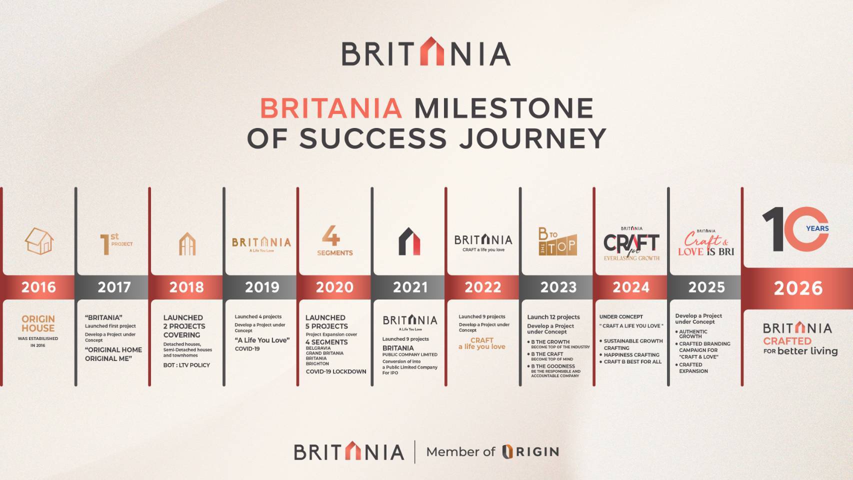 กฤษณ์ เตชะสัมมา ประธานเจ้าหน้าที่บริหาร บริษัท บริทาเนีย จำกัด (มหาชน) เล่าย้อนกลับไปเมื่อ 10 ปีก่อนราวปี 2559 ว่า บริทาเนีย เปรียบเสมือนเหมือน New S-Curve ให้กับบริษัทแม่ คือ บริษัท ออริจิ้น พร็อพเพอร์ตี้ จำกัด (มหาชน) หรือ ORI ผู้พัฒนาคอนโดมิเนียมเป็นสินค้าหลัก ที่มีความต้องการจะขยายธุรกิจสู่ที่อยู่อาศัยแนวราบ (บ้านจัดสรร) ภายใต้บริษัท ออริจิ้น เฮ้าส์ จำกัด ด้วยทุนจดทะเบียน 1 ล้านบาท เลือกโลเคชันที่คุ้นเคย คือ ‘โซนตะวันออก’ เปิดโครงการแรกภายใต้ชื่อ “บริทาเนีย ศรีนครินทร์” เป็นโครงการบ้านเดี่ยวและบ้านแฝด 2 ชั้น จำนวน 149 ยูนิต เริ่มเปิดขายในเดือนพฤศจิกายน 2560 กระแสตอบรับดีมากใช้เวลาเพียงปีกว่า ๆ ในการปิดการขายโครงการ จากนั้นเดินเกมบุกต่อไม่หยุด ใช้สูตรทวีคูณเพิ่มพอร์ตไต่ระดับเติบโตและแบรนด์ “บริทาเนีย” เริ่มเป็นที่รู้จักในตลาดบ้านแนวราบ สู่การตัดสินใจเปลี่ยนชื่อจาก ออริจิ้น เฮ้าส์ มาเป็น “บริษัท บริทาเนีย จำกัด” ในปี 2562 เพื่อสะท้อนตัวตนของแบรนด์ และสร้างการรับรู้ของคำว่า “บริทาเนีย” ให้ชัดเจนยิ่งขึ้นในตลาดที่อยู่อาศัย ด้วยเอกลักษณ์ความเป็นบ้านสไตล์อังกฤษ