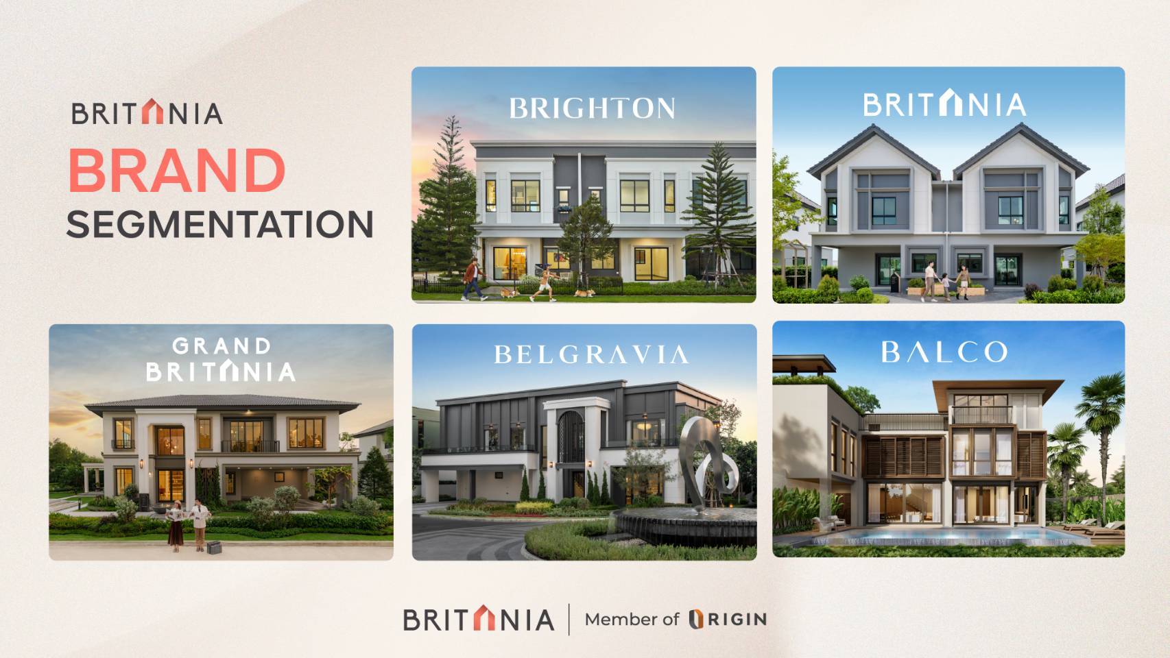 โดยบ้านกลุ่มแรกพัฒนาภายใต้แบรนด์ “ไบรตัน” (Brighton) แบรนด์บ้านแฝด และทาวน์โฮม ระดับเริ่มต้นราคา 2.5 - 4 ล้านบาท และกลุ่มที่ 2 แบรนด์ “บริทาเนีย” (Britania) แบรนด์บ้านเดี่ยว บ้านแฝด และทาวน์โฮม ระดับ Mid-end ราคา 4 - 8 ล้านบาทขึ้นไป กลุ่มที่ 3 เจาะระดับ High-End ภายใต้แบรนด์ “แกรนด์ บริทาเนีย” (Grand Britania) บ้านเดี่ยวระดับพรีเมี่ยม ราคา 8 - 20 ล้านบาทขึ้นไป กลุ่มที่ 4 บ้านเดี่ยว ระดับ Luxury ราคา 20 - 50 ล้านบาทขึ้นไป ภายใต้แบรนด์ “เบลกราเวีย” (Belgravia) และกลุ่มที่ 5 แบรนด์ใหม่ บ้านพักตากอากาศพูลวิลล่า ระดับ Luxury ภายใต้แบรนด์ "บัลโค" (Balco) เจาะกลุ่มเป้าหมายลูกค้าที่ต้องการบ้านพักตากอากาศระดับ Luxury ราคา 32 - 60 ล้านบาท เน้นโครงการใกล้ชิดธรรมชาติและทำเลศักยภาพระดับ World Destination เช่น บางเทา ภูเก็ต ตอบโจทย์ผู้ที่ต้องการบ้านพักตากอากาศที่หรูหรา ใส่ใจในรายละเอียด และเป็นส่วนตัว โดยในไตรมาส 2 ปีนี้ บริทาเนีย เตรียมทยอยรับรู้รายได้จากการโอนกรรมสิทธิ์โครงการ บัลโค บางเทา บีช มูลค่าโครงการกว่า 1,350 ล้านบาท