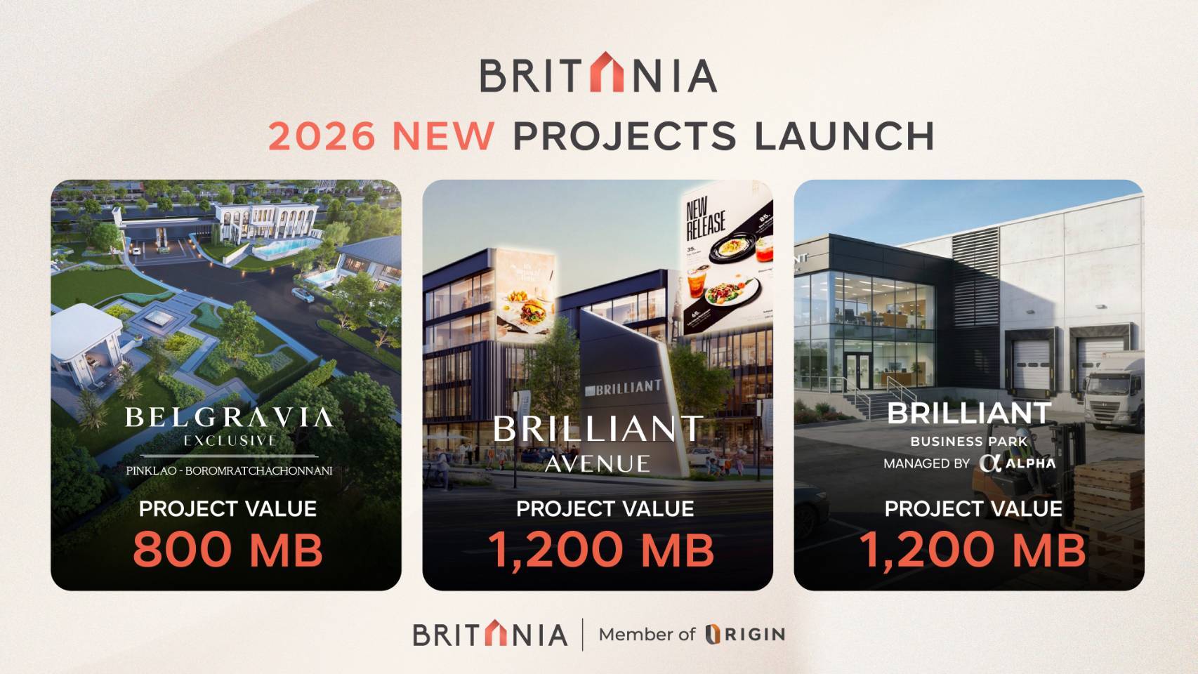 และในปี 2569 นี้ บริทาเนีย มีแผนเปิดตัวโครงการใหม่ 3 โครงการ มูลค่าโครงการรวม 3,200 ล้านบาท เน้นทำเลศักยภาพในพื้นที่กรุงเทพฯ และต่างจังหวัด ประกอบด้วย เบลกราเวีย เอ็กซ์คลูซีฟ ปิ่นเกล้า-บรมราชชนนี บ้านหรูระดับลักชัวรี มูลค่าโครงการเฟสแรก 800 ล้านบาท ซึ่งสะท้อนถึงการยกระดับมาตรฐานการอยู่อาศัยเพื่อตอบโจทย์กลุ่มลูกค้าระดับพรีเมียม