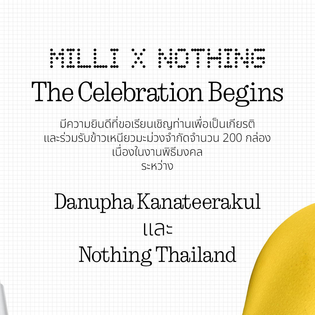 สามารถติดตามจุดเริ่มต้นครั้งใหม่ของ Nothing Thailand และ MILLI ได้ในงานอีเวนต์ “MILLI meets Nothing: The Celebration Begins” วันที่ 25 เมษายน 2569 เวลา 16:00 - 18:00 ณ Siam Center ฝั่งลานน้ำพุ ใจกลางสยาม ซึ่งจะถูกเนรมิตให้เป็นพื้นที่เฉลิมฉลองครั้งใหญ่ เพื่อขอบคุณแฟน ๆ ที่ร่วมเชียร์ทั้ง Nothing และ MILLI ตลอดที่ผ่านมา สำหรับแฟน ๆ ที่อยากเป็นส่วนหนึ่งของโมเมนต์สำคัญครั้งนี้ สามารถ walk-in ร่วมงานได้ โดย 200 คนแรกจะได้รับสิทธิ์พิเศษในการเข้าร่วมกิจกรรมอย่างใกล้ชิด