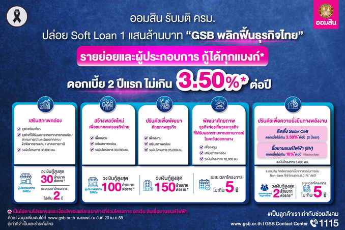 นายทรงพล ชีวะปัญญาโรจน์ ผู้อำนวยการธนาคารออมสิน เปิดเผยว่า ตามมติคณะรัฐมนตรี เมื่อวันที่ 11 เมษายน 2569 เห็นชอบการออกมาตรการดูแลผู้ที่ได้รับผลกระทบจากสถานการณ์วิกฤตพลังงาน ความไม่แน่นอนทางเศรษฐกิจและความขัดแย้งในต่างประเทศ โดยมอบหมายให้ธนาคารออมสินเป็นแกนหลักในการขับเคลื่อนมาตรการทางการเงินเพื่อเติมสภาพคล่องผ่าน โครงการสินเชื่อดอกเบี้ยต่ำ (Soft Loan) “GSB พลิกฟื้นธุรกิจไทย” วงเงิน 100,000 ล้านบาท มุ่งช่วยประชาชนและผู้ประกอบการ SMEs ปรับตัวรับมือวิกฤตที่ส่งผลกระทบต่อการดำรงชีวิตและการดำเนินธุรกิจ พร้อมสนับสนุนการเปลี่ยนผ่านสู่การใช้พลังงานทางเลือก โดยความร่วมมือของธนาคารพาณิชย์และสถาบันการเงินเฉพาะกิจทั้ง 16 แห่ง ในการส่งผ่านเงินทุนดอกเบี้ยต่ำไปยังกลุ่มเป้าหมายให้เร็วที่สุด