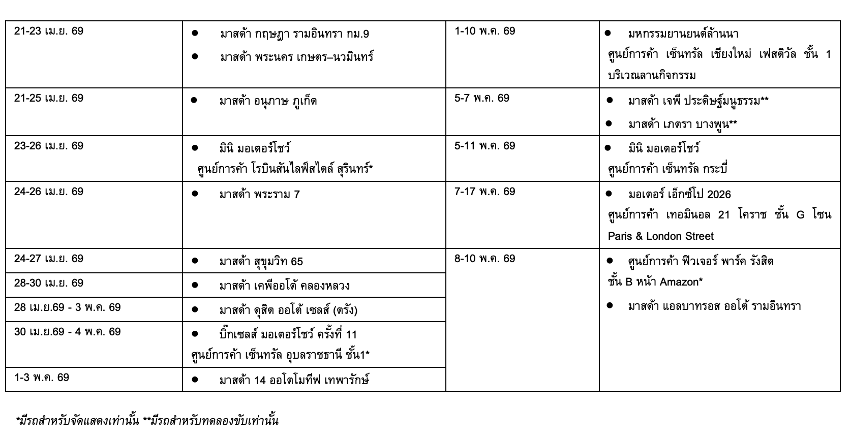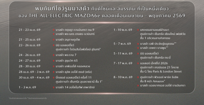 สำหรับลูกค้าที่ลงทะเบียนจองสิทธิ์ Mazda6e Premiere Package ยังสามารถรับสิทธิพิเศษเพิ่มเติมตามเงื่อนไขได้จนถึงวันที่ 31 สิงหาคม 2569 นี้*** ทั้งนี้ มาสด้าต้องขอขอบคุณลูกค้าทุกท่านเป็นอย่างสูง ที่ให้การตอบรับต่อรถยนต์ไฟฟ้าจากมาสด้าเป็นอย่างดี และขอเชิญชวนลูกค้าที่สนใจเป็นเจ้าของ THE ALL-ELECTRIC MAZDA6e เข้ามาทดลองขับพร้อมรับข้อเสนอพิเศษที่โชว์รูมมาสด้าและห้างสรรพสินค้าชั้นนำ ตลอดเดือนเมษายน – พฤษภาคม 2569 ได้ตามวันและสถานที่ดังต่อไปนี้