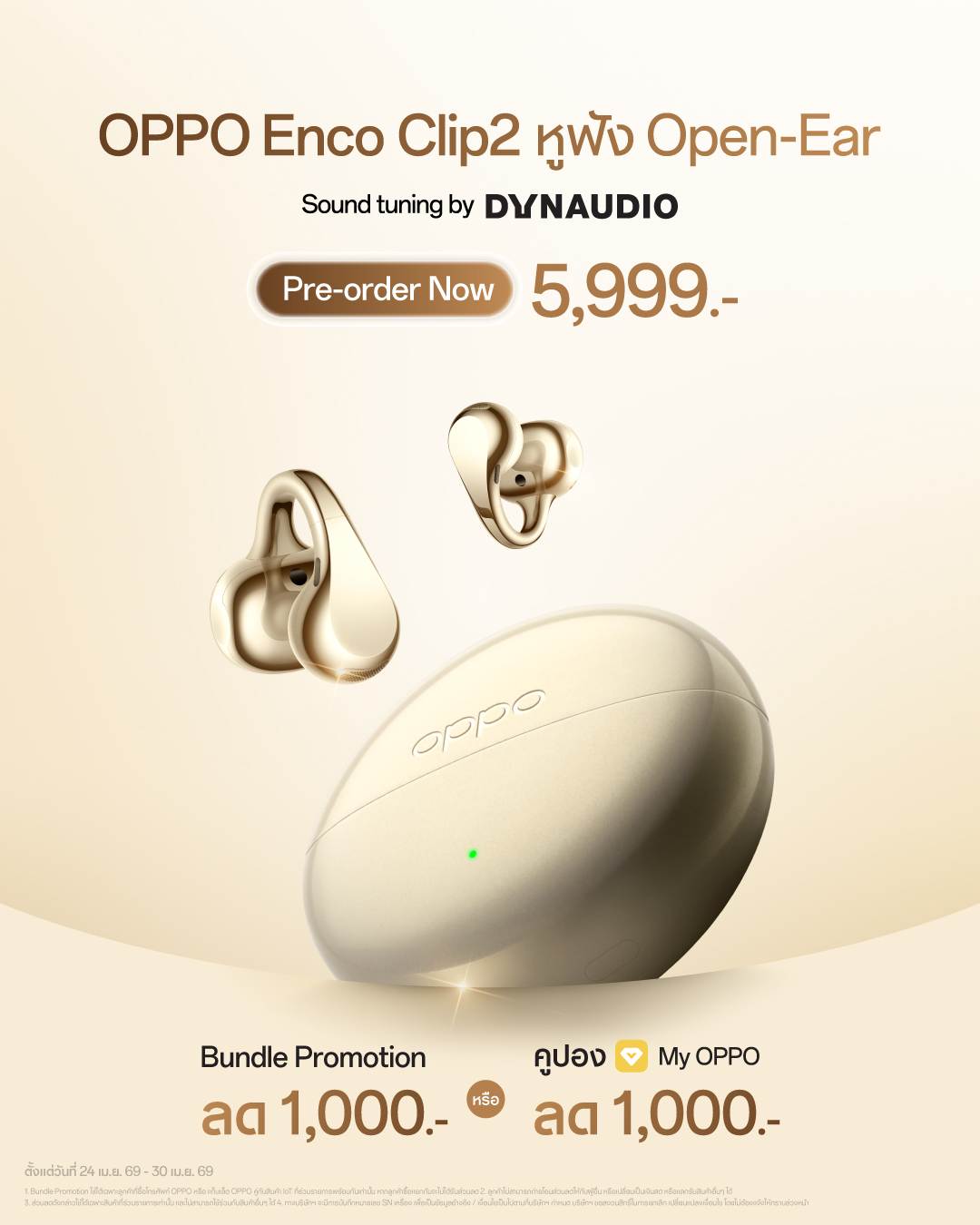 ออปโป้เดินหน้าเติมเต็มอีโคซิสเต็มด้วยผลิตภัณฑ์ IoT รุ่นล่าสุด นำโดย OPPO Enco Clip2 หูฟังโอเพนเอียร์สไตล์ Ear Cuff ดีไซน์เทรนดี้รูปทรงไร้รอยต่อที่เน้นความเบาสบายแบบ Zero-Sense ชูจุดขายหนึ่งเดียวในกลุ่มหูฟังโอเพนเอียร์ที่ได้รับมาตรฐานการปรับจูนเสียงจากแบรนด์ระดับโลกอย่าง Dynaudio ผสานเทคโนโลยี Bone Conduction เพื่อการสนทนาที่คมชัด มั่นใจด้วยมาตรฐานกันน้ำ IP55 และแบตเตอรี่ที่ใช้งานได้ยาวนานต่อเนื่อง 40 ชั่วโมง วางจำหน่ายราคา 5,999 บาท