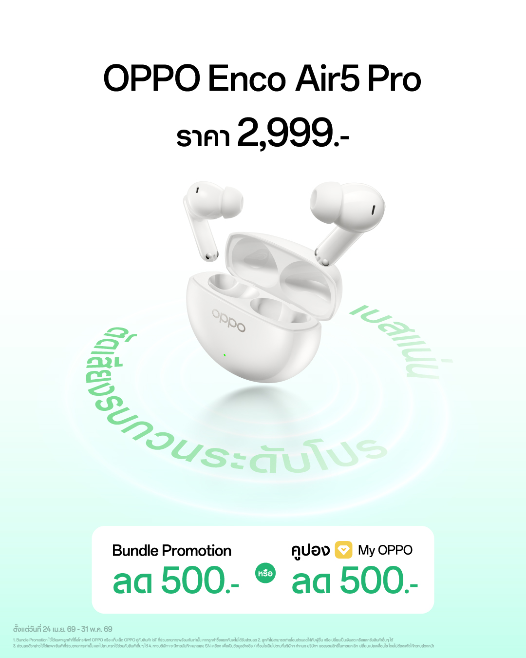 ในส่วนของหูฟังไร้สายระดับโปร OPPO Enco Air5 Pro มุ่งเน้นการมอบอรรถรสการฟังขั้นสูงสุดด้วยระบบตัดเสียงรบกวน 55 เดซิเบล ผ่านการรับรองจาก TÜV Rheinland มาพร้อมไดรเวอร์ขนาดใหญ่ 12 มม. เคลือบไทเทเนียม รองรับ Hi-Res Audio และ LHDC 5.0 พร้อมอัดแน่นด้วยฟีเจอร์อัจฉริยะอย่าง AI Translate แปลภาษาแบบเรียลไทม์ และแบตเตอรี่ที่ตอบโจทย์การใช้งานยาวนานสูงสุดถึง 54 ชั่วโมง วางจำหน่ายราคา 2,999 บาท