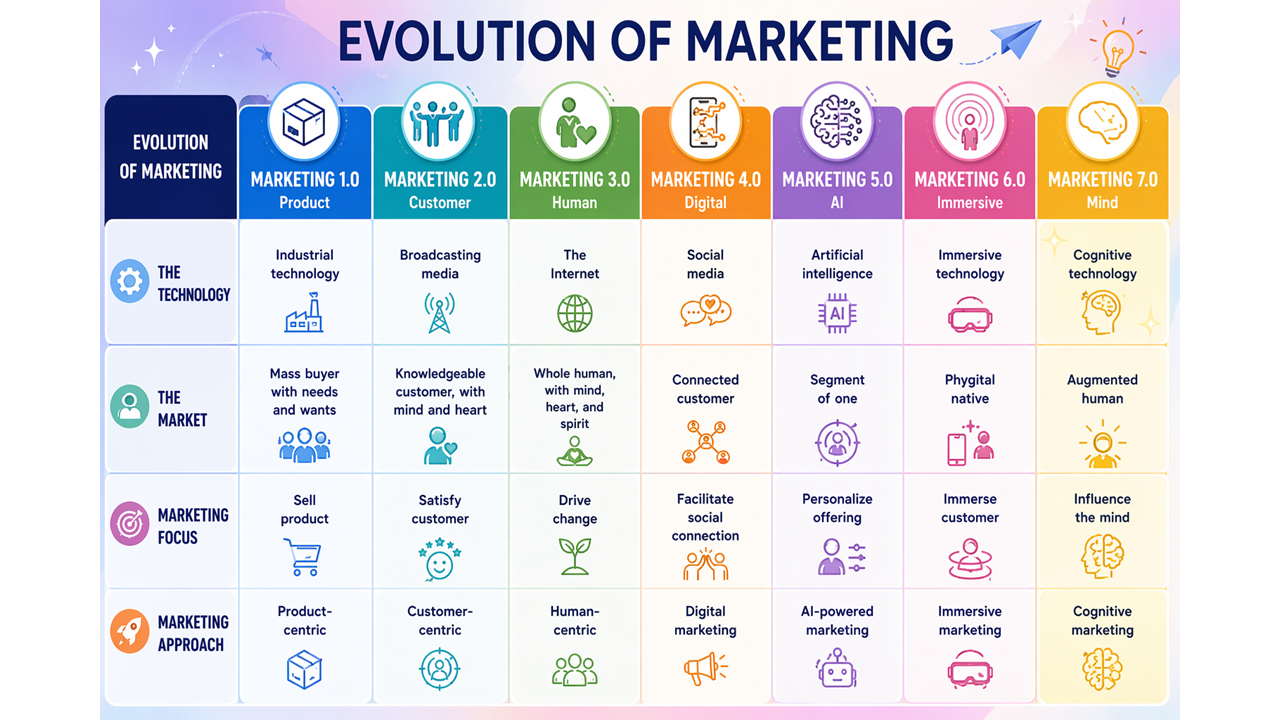 การตลาดย้อนแย้ง... ความท้าทายใหม่ที่นักการตลาดต้องเปิดใจ ในยุค Marketing 7.0 นักการตลาดต้องเผชิญกับ “ความย้อนแย้ง” (Paradox) ของเทคโนโลยี โดยเฉพาะ AI ที่แม้จะช่วยเพิ่มประสิทธิภาพในการสร้างสรรค์ผลงานได้รวดเร็วและประหยัดงบประมาณ แต่ในทางกลับกัน ผู้บริโภคอาจรู้สึกว่าขาดจิตวิญญาณและความเคารพในศิลปะ นอกจากนี้ AI ยังเริ่มเข้ามามีบทบาทในฐานะ “Augmented Human” ที่ช่วยตัดสินใจซื้อแทนมนุษย์ (AI Shopping) ซึ่งกลายเป็นโจทย์สำคัญว่า แบรนด์จะสร้างตัวตนอย่างไรให้ AI แนะนำลูกค้า และจะหลีกเลี่ยงความจำเจ (Bias) ของ AI ที่มักจะแนะนำกลยุทธ์ที่คล้ายคลึงกันได้อย่างไร