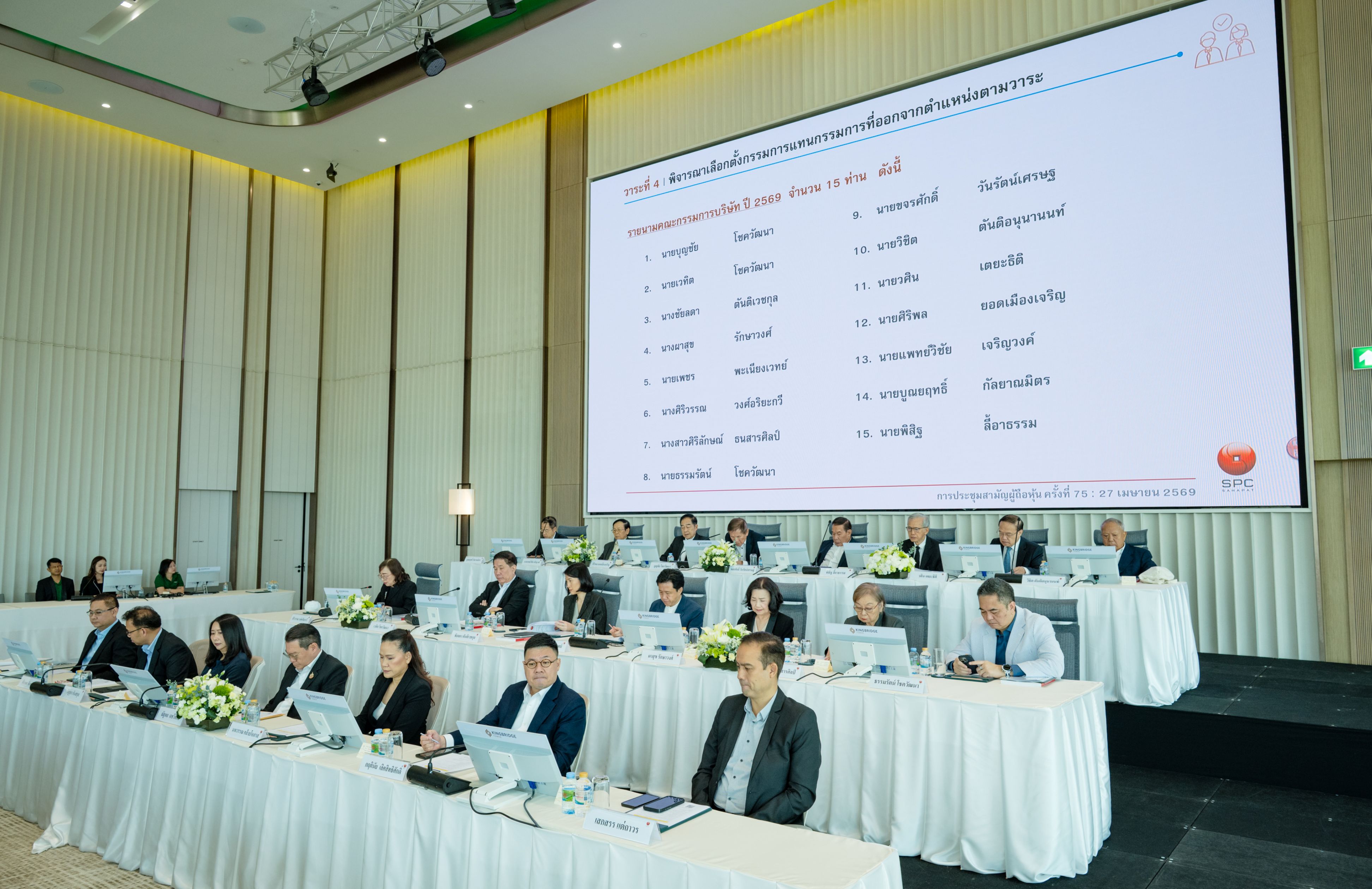 นายบุญชัย โชควัฒนา ประธานกรรมการ บริษัท สหพัฒนพิบูล จำกัด (มหาชน) หรือ SPC ผู้จัดจำหน่ายสินค้าอุปโภคบริโภคชั้นนำของไทย พร้อมด้วยคณะกรรมการบริษัทและคณะผู้บริหาร เข้าร่วมการประชุมสามัญผู้ถือหุ้นประจำปี 2569 (ครั้งที่ 75) เพื่อรายงานผลการดำเนินงานในรอบปี 2568 และตอบข้อซักถามจากผู้ถือหุ้น เมื่อวันที่ 27 เมษายน 2569 ณ ห้อง Kingbridge Hall ชั้น 4 อาคารคิงบริดจ์ ทาวเวอร์ กรุงเทพมหานคร
