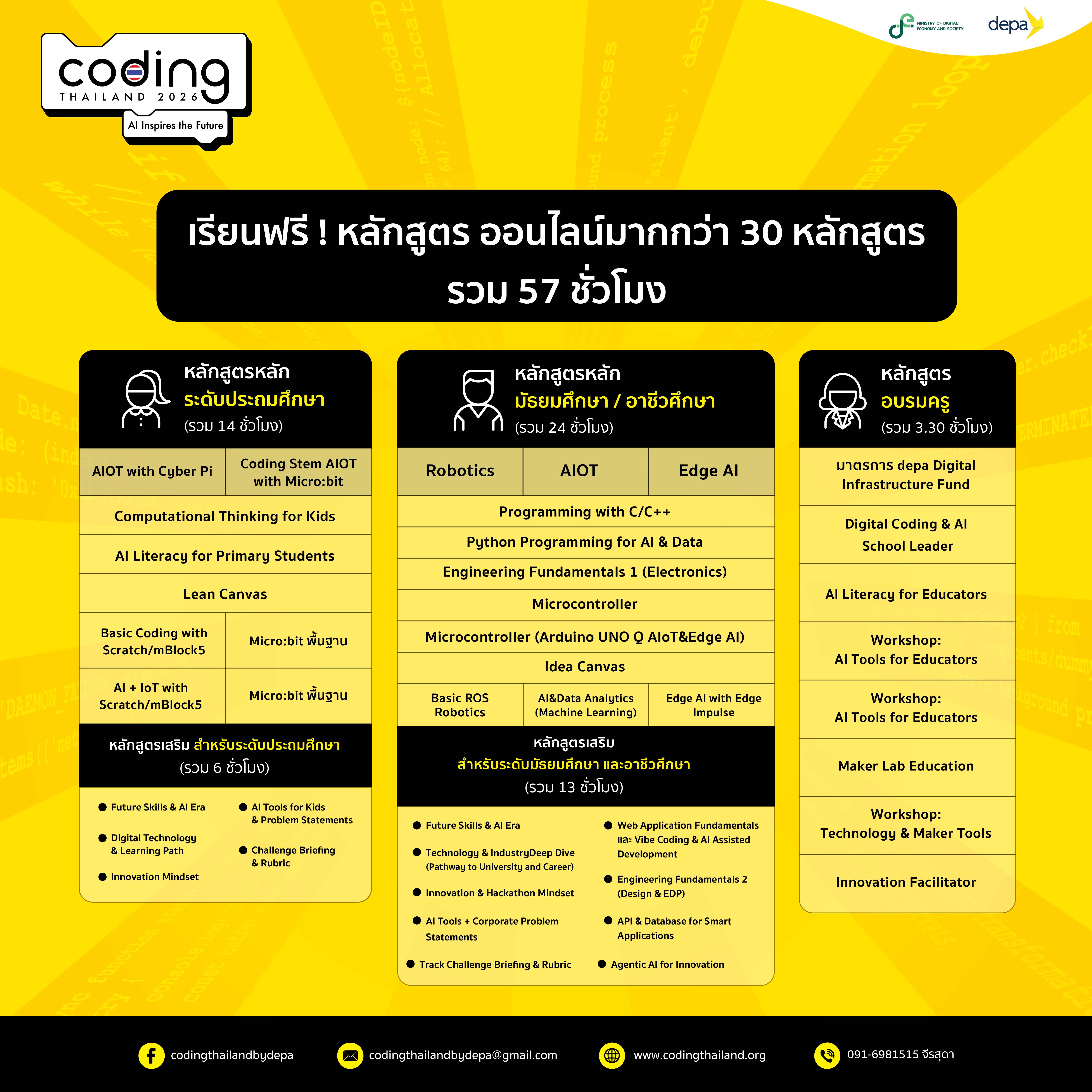 เรียนออนไลน์ได้ ฟรี! ผ่านเว็บไซต์ codingthailand.co สำหรับน้อง ๆ เยาวชนที่สนใจเข้าเวิร์คช็อปและเวทีแข่งขัน Coding & AI สุดยิ่งใหญ่ ภายใต้โครงการ Coding Thailand 2026: AI Inspires the Future จะต้องผ่านหลักสูตรบังคับตามเกณฑ์ที่กำหนด และสมัครเข้าร่วมเป็นทีม (นักเรียน 3 คน , ครู 1 คน) ตั้งแต่วันนี้ – 5 มิถุนายน 2569 โดยปิดรับสมัครตามภูมิภาค ดังนี้ ภาคกลาง ภาคตะวันตก และภาคตะวันออก (8 พฤษภาคม 2569) ภาคเหนือตอนบนและภาคอีสานตอนล่าง (15 พฤษภาคม 2569) ภาคเหนือตอนล่างและภาคอีสานตอนกลาง (29 พฤษภาคม 2569) ภาคใต้ตอนบนและภาคใต้ตอนล่าง (5 มิถุนายน 2569) ติดตามรายละเอียดเพิ่มเติมได้ที่ Facebook Page: CodingThailand by depa