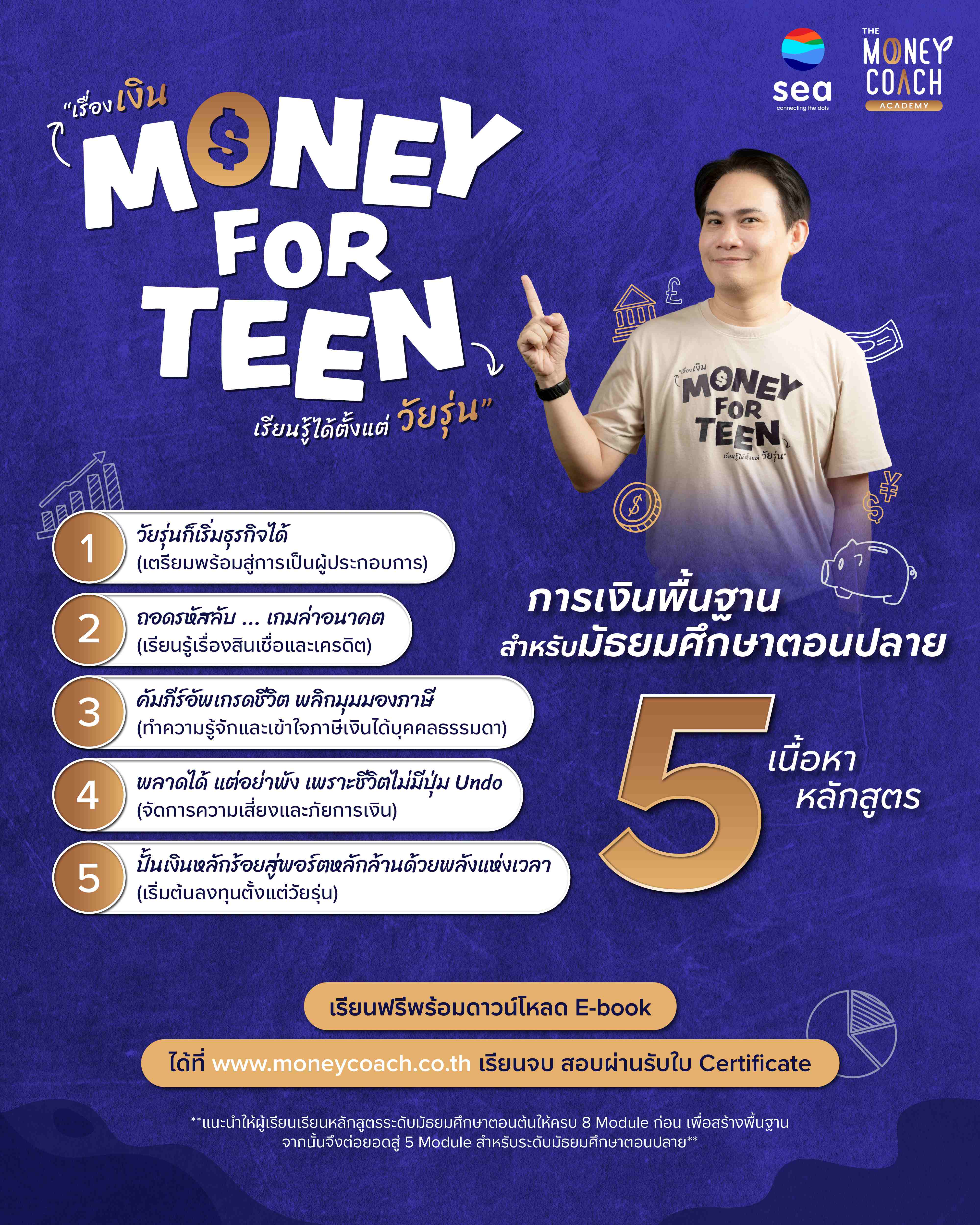 การอัปเดตเนื้อหาหลักสูตร Money for Teen สำหรับวัยมัธยมปลายในครั้งนี้ มีการเพิ่มเนื้อหาด้านการเงิน 5 หัวข้อสำคัญที่เป็นรากฐานสู่ความมั่นคงและมั่งคั่งในอนาคต ซึ่งได้รับการออกแบบโดยโค้ชหนุ่ม The Money Coach ผู้เชี่ยวชาญด้านการเงินตัวจริงพร้อมการสนับสนุนจาก Sea Academy