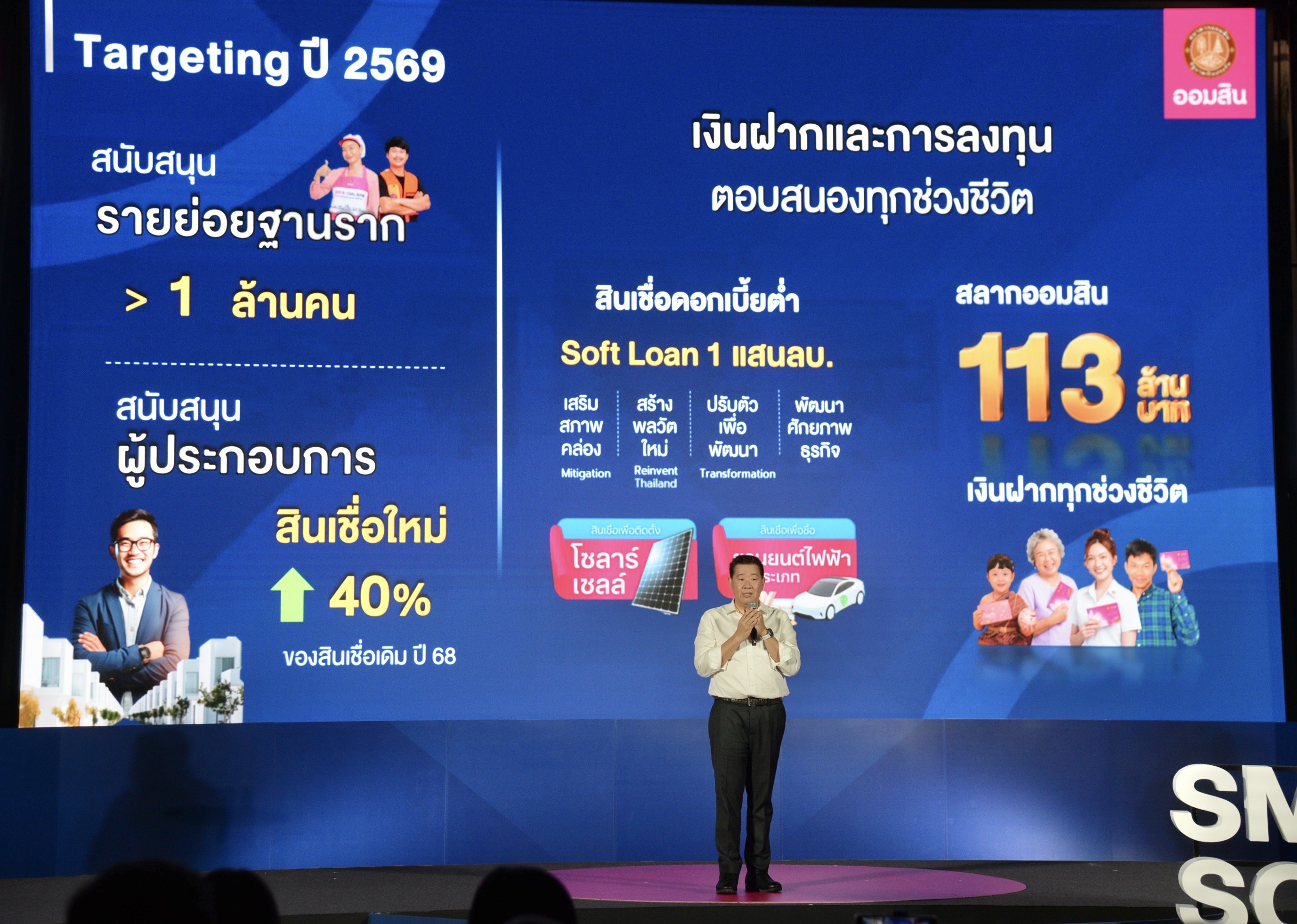 สำหรับทิศทางการดำเนินงานในปี 2569 ธนาคารออมสิน ตั้งเป้าหมายสนับสนุนประชาชนฐานรากได้มากกว่า 1 ล้านคน เพิ่มสัดส่วนสินเชื่อใหม่แก่ผู้ประกอบการมากกว่าร้อยละ 40 ของสินเชื่อรวมในปี 2568 พร้อมเดินหน้าพัฒนาผลิตภัณฑ์ทางการเงินที่ตอบโจทย์ทุกช่วงชีวิต อาทิ สินเชื่อดอกเบี้ยต่ำ (Soft Loan) ที่สนับสนุนการใช้พลังงานทดแทน ทั้งที่เป็นการกู้ติดตั้งระบบโซลาร์เซลล์และกู้เพื่อซื้อยานยนต์ไฟฟ้า การเปิดจำหน่ายสลากออมสินพิเศษในโอกาสครบรอบก่อตั้งธนาคาร 113 ปี รวมถึงผลิตภัณฑ์เงินฝากที่มีสิทธิประโยชน์ เช่น เงินฝากแบบมีประกันชีวิต/ประกันสุขภาพ เพื่อส่งเสริมการออมและสร้างความมั่นคงทางการเงินให้คนไทยในทุกมิติ