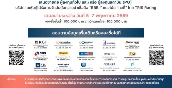 สำหรับวัตถุประสงค์การออกหุ้นกู้ เพื่อใช้ชำระคืนหนี้อื่น และ/หรือ ชำระหนี้ภายในกลุ่มบริษัท และ/หรือ ชำระคืนหนี้จากการออกตราสารหนี้ (Roll Over) ภายในเดือนพฤษภาคม 2569 หุ้นกู้ที่ออกและเสนอขายดังกล่าว เป็นหุ้นกู้ระยะยาว ชนิดระบุชื่อผู้ถือ ประเภทไม่ด้อยสิทธิ มีประกัน มีผู้แทนผู้ถือหุ้นกู้ และผู้ออกหุ้นกู้มีสิทธิไถ่ถอนก่อนวันครบกำหนดไถ่ถอน ซึ่งความน่าเชื่อถือของหุ้นกู้ อันดับ “BBB-” แนวโน้ม “Stable” จากทริสเรทติ้ง เมื่อวันที่ 31 มีนาคม 2569