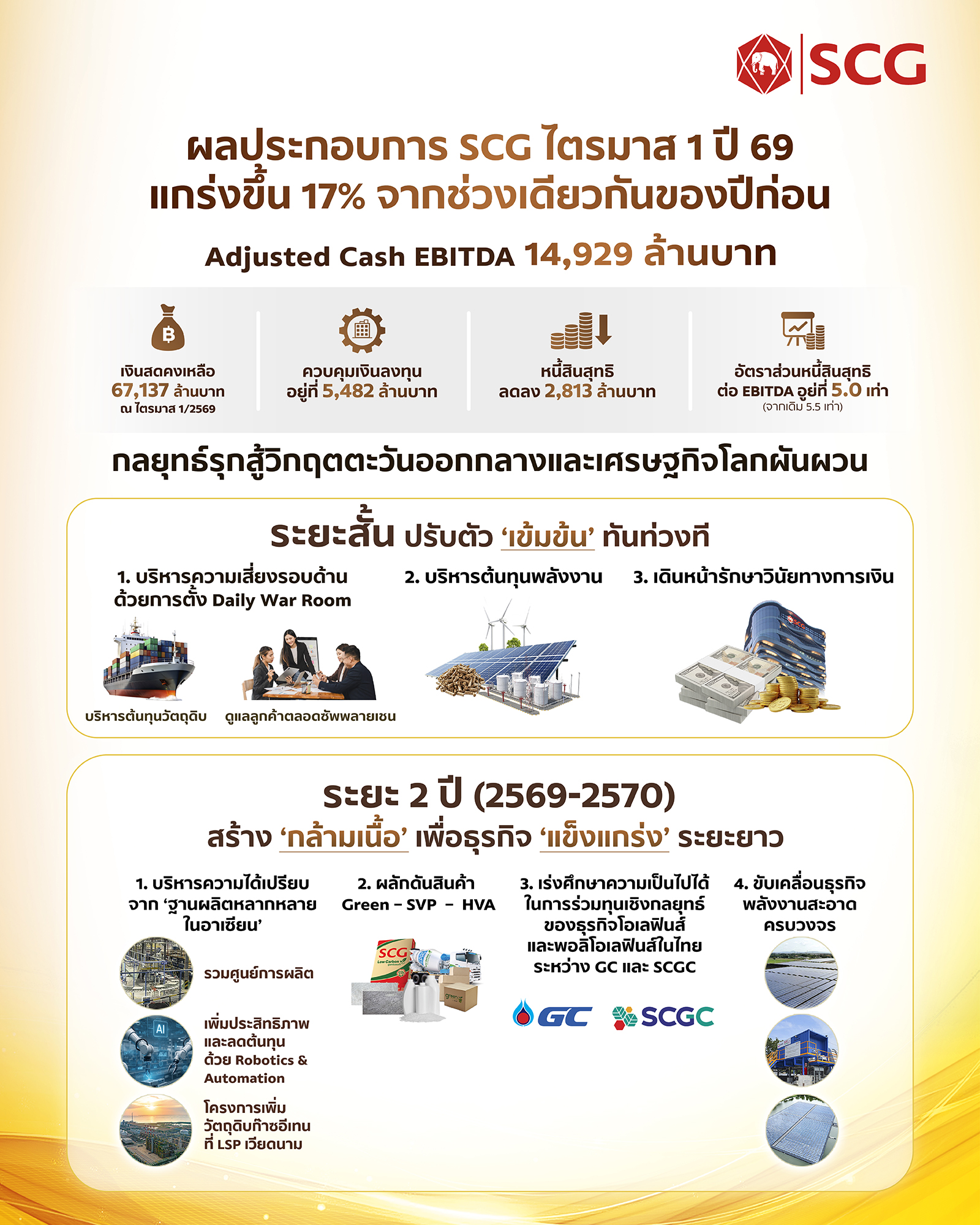 ผลประกอบการ SCG ไตรมาส 1 ปี 2569 มี Adjusted Cash EBITDA 14,929 ล้านบาท แกร่งขึ้น 17% จากช่วงเดียวกันของปีก่อน คาดสถานการณ์ตะวันออกกลางทำเศรษฐกิจโลกชะลอ ราคาพลังงาน วัตถุดิบผันผวนต่อ เร่งกลยุทธ์ “ระยะสั้น” บริหารต้นทุนวัตถุดิบ พลังงาน ดูแลลูกค้าต่อเนื่อง ด้วย Daily War Room ปรับตัวทันท่วงที พร้อมเดินหน้าวินัยการเงินเข้มข้น “ระยะ 2 ปี (2569-2570)” มุ่งสร้างความแข็งแกร่งระยะยาว บริหารความได้เปรียบจากฐานผลิตหลากหลายในอาเซียนใช้ Robotics & Automation เดินหน้าโครงการ LSPE เวียดนาม คืบหน้าตามแผน – ผลักดันสินค้ากรีน & ราคาคุ้มค่า & มูลค่าเพิ่มสูง – เร่งศึกษาความเป็นไปได้ในการร่วมทุนเชิงกลยุทธ์ของธุรกิจโอเลฟินส์และพอลิโอเลฟินส์ในไทยระหว่าง GC และ SCGC – ขับเคลื่อนธุรกิจพลังงานสะอาดครบวงจร