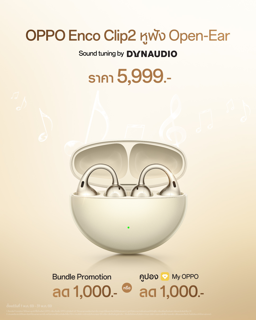 สำหรับลูกค้าที่ซื้อ OPPO Enco Clip2 ในช่วงวันที่ 1 พฤษภาคม 2569 ถึง 31 พฤษภาคม 2569 จะได้รับสิทธิพิเศษ รับส่วนลด Bundle มูลค่า 1,000 บาท หรือคูปองส่วนลด My OPPO มูลค่า 1,000 บาท