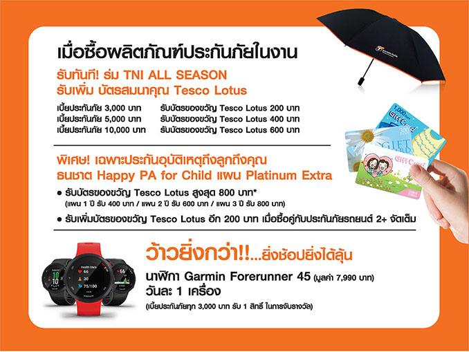 นอกจากนี้ ยังจัดเต็มข้อเสนอและของสมนาคุณพิเศษเฉพาะในงาน อาทิ รับทันที! ร่ม TNI All Seasons เมื่อซื้อผลิตภัณฑ์ประกันภัยที่บูธ และรับเพิ่มบัตรของขวัญ Tesco Lotus สูงสุด 600 บาท เมื่อมียอดจ่ายเบี้ยประกันตามเงื่อนไขที่กำหนด พิเศษ! เฉพาะประกันอุบัติเหตุถึงลูกถึงคน ธนชาต Happy PA for Child แผน Platinum Extra รับบัตรของขวัญ Tesco Lotus สูงสุด 800 บาท และรับเพิ่มอีก 200 บาท เมื่อซื้อคู่กับประกันภัยรถยนต์ โดยเบี้ยประกันทุก 3,000 บาท รับสิทธิ์ลุ้นชิงนาฬิกา Garmin Forerunner 45 มูลค่า 7,999 บาท จับรางวัล แจกทุกวัน วันละ 1 เครื่อง