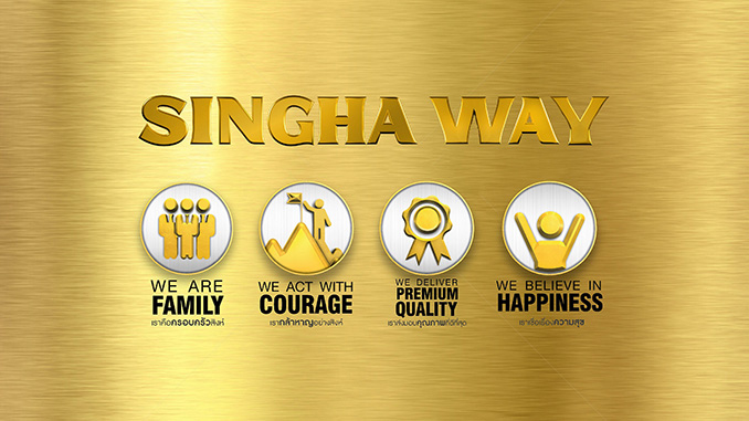 “Singha Way คือค่านิยมและวัฒนธรรมองค์กรของคนหัวใจสิงห์ ซึ่งถือเป็น DNA ที่เราให้ความสำคัญกับการสร้างคน บน 4 แกนหลัก คือ ความกล้า (Courage) กล้าคิด กล้าทำ กล้าตัดสินใจเพื่อให้ได้มาซึ่งสิ่งที่ดีที่สุด เพื่อส่งมอบสินค้าและบริการที่มีคุณภาพ (Premium Quality) เป็นการส่งต่อความสุข (Happiness) ให้กับทุกคน ไม่ว่าจะเป็นเพื่อนพนักงาน คู่ค้า ลูกค้า เพราะทุกคนคือสมาชิกครอบครัวเดียวกัน (Family)”