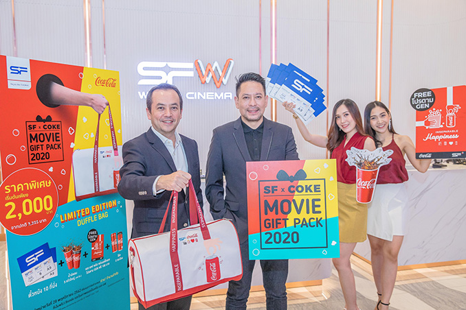 โรงภาพยนตร์ในเครือ เอส เอฟ โดยคุณเดชา ธรรมชัยพิเนต ผู้อำนวยการฝ่ายพัฒนาธุรกิจ บริษัท เอส เอฟ คอร์ปอเรชั่น จำกัด (มหาชน) และ คุณเจสัน ไรลีย์ รองผู้ช่วยกรรมการผู้จัดการ – Horeca บริษัท ไทยน้ำทิพย์ คอมเมอร์เชียล จำกัด ร่วมฉลองเทศกาลแห่งความสุขด้วยชุดของขวัญสุดพิเศษสำหรับคนรักหนังกับ “SF Coke Movie Gift Pack 2020” (เอส เอฟ โค้ก มูฟวี่ กิฟต์ แพ็ก 2020) โดยภายในชุดประกอบด้วย Duffle Bag กระเป๋าสุดเท่ 1 ใบ, บัตรสมาชิก SF+ ลายพิเศษ 1 ใบ พร้อมสิทธิ์สมัครแพ็กเกจโปรตาม GEN ฟรี 1 สิทธิ์, โค้ดสำหรับแลกบัตรชมภาพยนตร์ จำนวน 10 ที่นั่งและเครื่องดื่มขนาด 44 ออนซ์ จำนวน 5 แก้ว รวมถึงเครื่องดื่มโค้ก 2 กระป๋อง ในราคาสุดคุ้มเพียงชุดละ 3,500 / 2,000 / 1,900 / 1,700 / 1,500 และ 1,100 บาท (ราคาขึ้นอยู่กับสาขาที่จัดจำหน่าย)