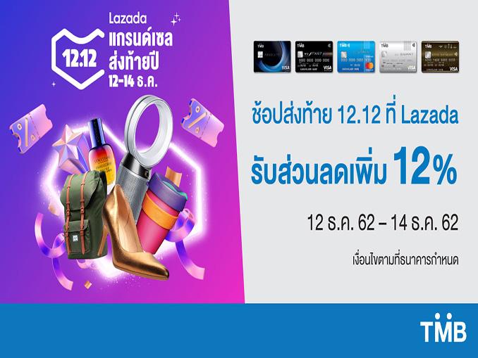 บัตรเครดิต TMB ร่วมกับ Lazada ชวนช้อปออนไลน์สุดคุ้ม 12.12 มอบส่วนลดเพิ่ม 12% เมื่อช้อปครบ 1,200 บาทขึ้นไปที่ www.lazada.co.th หรือ LAZ APP สูงสุด 250 บาท เพียงใส่โค้ด TMBGYS12 โดยคำนวณจากยอดใช้จ่ายจริงหลังจากหักส่วนลดต่างๆ แล้ว ระหว่างวันที่ 12-14 ธันวาคม 2562 เท่านั้น สงวนสิทธิ์การใช้โค้ด 1 ครั้ง / ผู้ใช้ และโค้ดมีจำนวนจำกัด