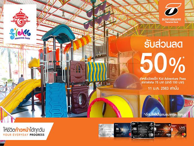 ธนาคารธนชาต จำกัด (มหาชน) จัดโปรโมชั่นฉลองวันเด็กแห่งชาติ ร่วมกับ สยามอะเมซิ่งพาร์ค (Siam AMAZING Park) ให้ลูกค้าบัตรเครดิตธนชาตพาครอบครัวไปฉลองวันเด็ก รับส่วนลด 50% เมื่อซื้อบัตรสำหรับเด็ก Kid Adventure Pass ผ่านประตู เล่นสวนน้ำ เล่นเครื่องเล่นในโซนสมอลเวิล์ด และแฟมิลี่เวิล์ด ไม่จำกัดรอบตลอดวัน ในราคาพิเศษเพียง 75 บาท (จากปกติ 150 บาท ) สำหรับเด็กที่มีส่วนสูง 101-130 ซม. เท่านั้น ส่วนเด็กที่มีความสูงไม่เกิน 100 ซม. ผู้สูงอายุ 60 ปีขึ้นไป และผู้พิการ สามารถผ่านประตูและเล่นสวนน้ำฟรี! โดยลูกค้าสามารถรับสิทธิ์ได้ในวันเสาร์ที่ 11 ม.ค. 2563
