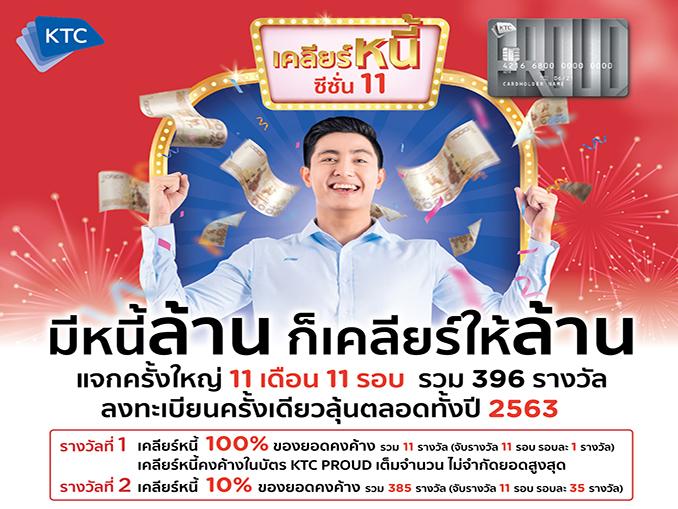 พิชามน จิตรเป็นธรรม ผู้อำนวยการ – ธุรกิจสินเชื่อบุคคล “เคทีซี” หรือ บริษัท บัตรกรุงไทย จำกัด (มหาชน) เปิดแคมเปญเสริมสร้างวินัยในการใช้จ่ายครั้งใหม่ “เคลียร์หนี้” ซีซั่น 11 ให้สมาชิกบัตรกดเงินสด “เคทีซี พราว” ที่มีประวัติการชำระดี รับโอกาสลุ้นแบ่งเบาและปลดภาระหนี้ที่มีอยู่ถึง 11 เดือน 11 รอบ รวม 396 รางวัล โดยลงทะเบียนครั้งเดียวสามารถลุ้นรับรางวัลได้ตลอดปี 2563 รางวัลที่ 1 มี 11 รางวัล รับการเคลียร์หนี้คงค้างในบัตร “เคทีซี พราว” เต็มจำนวน ไม่จำกัดยอดสูงสุด (จับรางวัล 11 รอบๆ ละ 1 รางวัล) รางวัลที่ 2 มี 385 รางวัล รับการเคลียร์หนี้ 10% ของยอดคงค้าง (จับรางวัล 11 รอบๆ ละ 35 รางวัล)