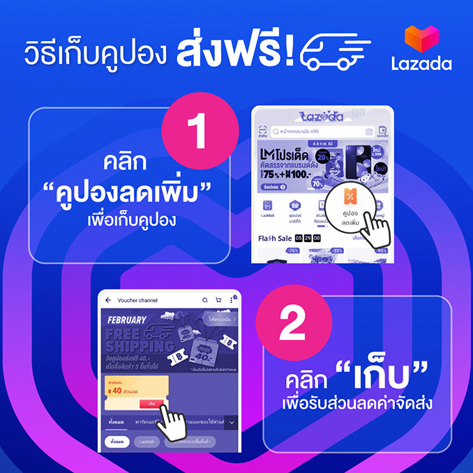 ตลอดเดือนกุมภาพันธ์นี้ ช้อปสินค้าแบบจุใจ พร้อมรับคูปองส่วนลดค่าส่งง่ายๆ เพียงกดเข้าแอป และเก็บคูปองลาซาด้าตามขั้นตอน ดังนี้