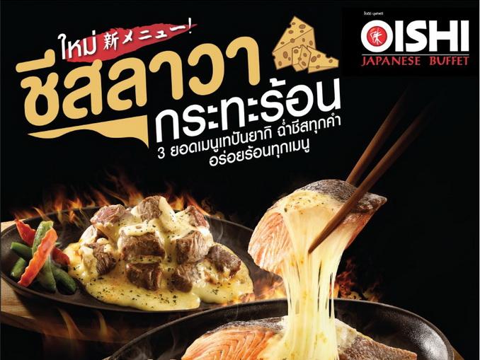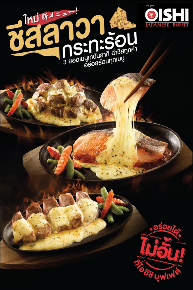 โออิชิ บุฟเฟต์ (OISHI Buffet) เสนอเมนูใหม่ ที่คัดสรรและนำเข้าชีสชั้นดีอย่างมอสซาเรลล่าชีส จากออสเตรเลีย ที่ขึ้นชื่อในเรื่องของความยืด...เยิ้ม...มาแต่งเสริมเติมรสชาติพิเศษให้กับเมนูเทปปันยากิที่คุ้นเคย ให้กลายเป็นเมนู เทปปันยากิ ชีสลาวากระทะร้อน ที่อร่อยยอดเยี่ยมหลากหลายรายการทั้ง แซลมอน, หมู และเนื้อ พร้อมเมนูมาตรฐานอื่นๆ มากกว่า 100 รายการ ตั้งแต่วันนี้ - 31 มกราคมศกหน้า เพิ่มเติมคลิก www.oishigroup.com