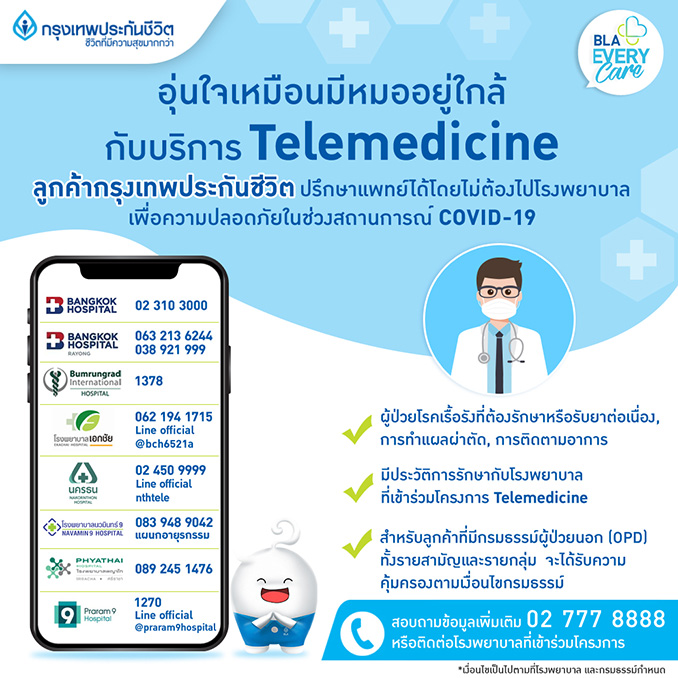 กรุงเทพประกันชีวิต จับมือโรงพยาบาลคู่สัญญา มอบบริการแพทย์ทางไกล (Telemedicine) ผ่านระบบเทคโนโลยีสมัยใหม่ อำนวยความสะดวก รวดเร็วในการดูแล ติดตาม ให้คำแนะนำ การติดตามผล และความปลอดภัยให้กับผู้ถือกรมธรรม์ รวมถึงสามารถเคลมค่าใช้จ่ายที่เกิดขึ้นผ่านทางระบบออนไลน์ เพื่อลดอัตราการเดินทางไปยังสถานที่สาธารณะภายใต้สถานการณ์การแพร่ระบาดของโรคติดเชื้อไวรัสโคโรน่า 2019 (COVID-19)