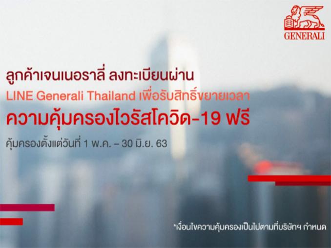 สำหรับลูกค้าเจนเนอราลี่ รับสิทธิ์ขยายเวลาความคุ้มครองไวรัสโควิด-19 เพิ่มเติมเพียงลงทะเบียนผ่านช่องทางไลน์ เจนเนอราลี่ ไทยแลนด์ (LINE Generali Thailand ) โดยจะได้รับความคุ้มครองค่ารักษาพยาบาลชดเชยรายวันเพิ่มเติม ในกรณีติดเชื้อไวรัสโคโรน่า 2019 (COVID-19) 1,000 บาท/ วัน สูงสุด 15 วัน พร้อมคุ้มครองกรณีการเจ็บป่วยภาวะโคม่า หรือกรณีเจ็บป่วยระยะสุดท้ายจากโรคติดเชื้อไวรัสโคโรนา 2019 (COVID-19) เพิ่มเติมเท่ากับวงเงินทุนประกันภัยตามกรมธรรม์ที่มีอยู่ไม่เกิน 100,000 บาท (จำกัด 1 สิทธิ์ ต่อ 1 ท่าน)*