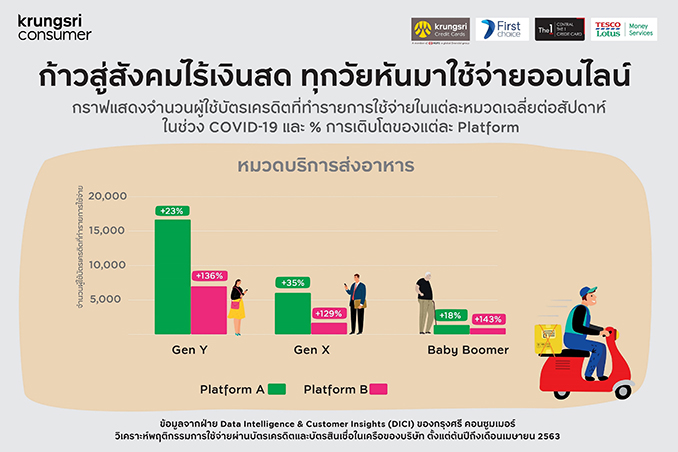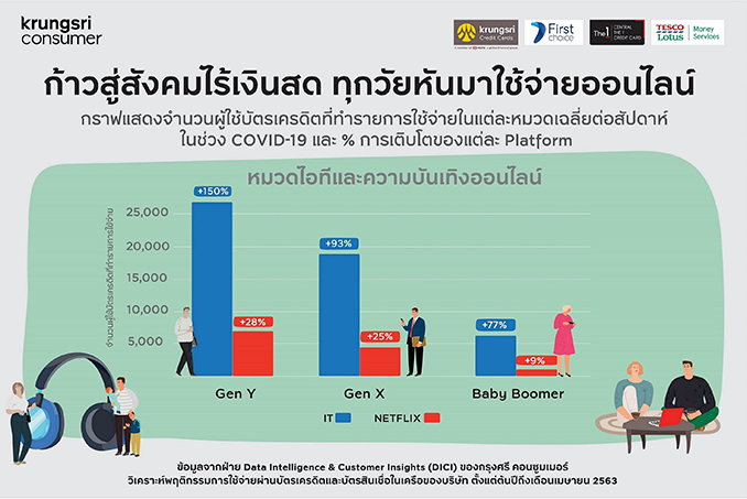 จากข้อมูลการใช้จ่ายผ่านบัตร ชี้ให้เห็นว่าช่วงมีนาคมถึงเมษายน 2563 จำนวนผู้ใช้บัตรเครดิตที่ทำรายการใช้จ่ายผ่านช่องทางออนไลน์เฉลี่ยต่อสัปดาห์ เพิ่มขึ้นถึง 37% โดยในจำนวนนี้ 10% เป็นผู้ใช้รายใหม่ ทั้งนี้ พบว่า ทุกวัยมีแนวโน้มใช้จ่ายผ่านช่องทางออนไลน์เพิ่มขึ้น แม้ว่ากลุ่มผู้ใช้ที่มีจำนวนมากที่สุดจะเป็นกลุ่ม Gen Y แต่กลุ่ม Baby Boomers ก็ปรับตัวมาใช้ช่องทางดิจิทัลได้เป็นอย่างดี โดยเฉพาะหมวดบริการส่งอาหาร และการช้อปปิ้งออนไลน์ โดยพบว่ากลุ่ม Baby Boomer มีจำนวนครั้งที่ใช้จ่ายผ่านบัตรเครดิตในบางแพลทฟอร์มเพิ่มขึ้นถึง 3 เท่า แสดงให้เห็นว่า ชีวิตวิถีใหม่เป็นตัวเร่งให้สังคมไทยก้าวสู่ยุคสังคมไร้เงินสด