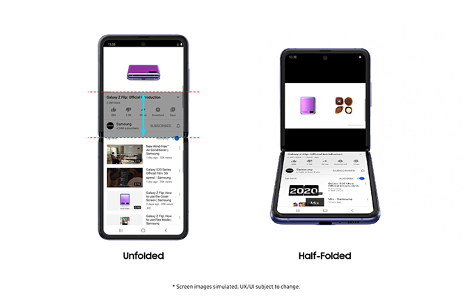 นอกจากด้านเฉดสี ดีไซน์ และนวัตกรรมอันล้ำสมัยแล้ว ซัมซุงยังได้ร่วมมือกับพันธมิตรอย่าง Google เพื่อยกระดับประสบการณ์การดูวิดีโอ YouTube บน Galaxy Z Flip ไปอีกขั้น ด้วยการปล่อยอัปเดทให้กับแอปพลิเคชัน YouTube สำหรับสมาร์ทโฟนพับได้ เพื่อรองรับการใช้งานสองหน้าจอหรือ Flex Mode ให้เป็นไปอย่างเต็มประสิทธิภาพ และมอบความเพลิดเพลินในการรับชม YouTube ให้กับผู้ใช้ได้อย่างเต็มที่และสะดวกกว่าที่เคย โดยเมื่อใช้งานใน Flex Mode บริเวณจอด้านบนของ Galaxy Z Flip จะปรากฏภาพคอนเทนต์วิดีโอจาก YouTube ที่ถูกปรับสัดส่วนให้พอดีกับหน้าจอขนาด 4 นิ้ว ในขณะที่จอด้านล่างจะแสดงแถบเครื่องมือต่างๆ รวมถึงช่องคอมเมนต์และวิดีโอแนะนำ