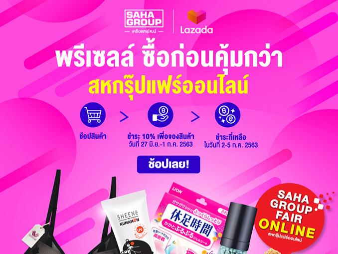 ทั้งนี้ ลูกค้าสามารถชำระเพียง 10% ของราคาสินค้าเพื่อจองสินค้า ตั้งแต่วันนี้ – 1 กรกฎาคม 2563 เฉพาะ LAZADA และลูกค้าสามารถชำระส่วนที่เหลือตั้งแต่วันที่ 2 - 5 กรกฎาคม 2563 สั่งซื้อสินค้าได้ที่ www.sahagroupfair.com และ https://pages.lazada.co.th/wow/camp/lazada/channel/th/brand/saha-group-campaign?&laz_trackid=2:mm_150081194_51302550_2010352622:clk5hhokf1ebvbc47hnaoo