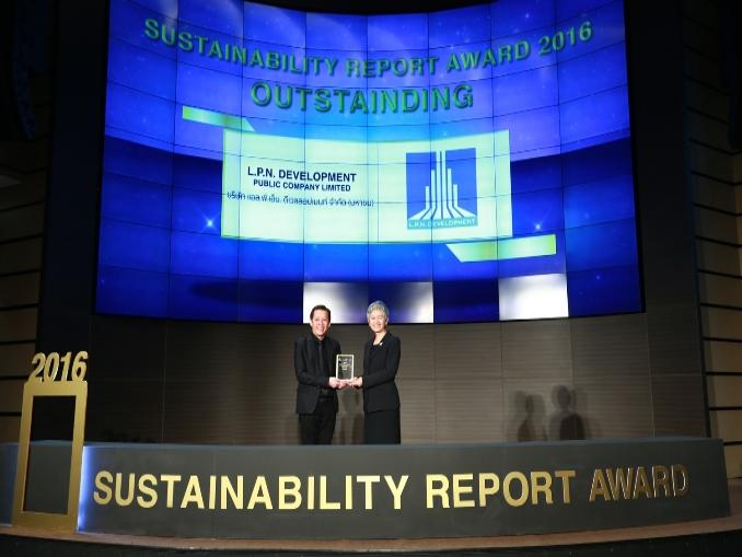 บมจ.แอล.พี.เอ็น.ดีเวลลอปเมนท์ จำกัด (LPN) โดย แสงชัย เหลืองจุฑามาศ ผู้ช่วยกรรมการผู้จัดการ สายงานบริหารแบรนด์ (ซ้าย) รับรางวัล “รายงานความยั่งยืนระดับดีเด่น ประจำปี 2559” (Sustainability Report Awards 2016) จาก อรนุช อภิศักดิ์ศิริกุล กรรมการ สมาคมบริษัทจดทะเบียนไทย (ขวา) ในพิธีประกาศรางวัลรายงานความยั่งยืนปี 2559 ณ ตลาดหลักทรัพย์แห่งประเทศไทย โดยรางวัลนี้จัดขึ้นเพื่อเป็นการส่งเสริมและยกระดับการจัดทำรายงานให้มีคุณภาพ มีเนื้อหาที่สมบูรณ์ตามมาตรฐานสากล อันสะท้อนความรับผิดชอบในการดำเนินธุรกิจของ LPN ที่คำนึงถึงผู้มีส่วนได้ส่วนเสีย ตั้งแต่กระบวนการก่อสร้างจนถึงการเข้าพักอาศัย เพื่อการเติบโตอย่างยั่งยืนต่อไป