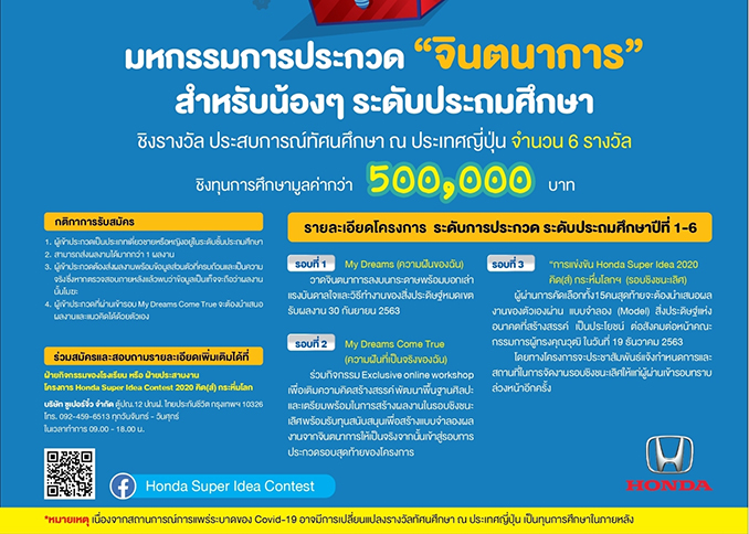 เมื่อความฝันและจินตนาการของเด็กและเยาวชนจะถูกจุดประกายให้กลายเป็นจริงขึ้นมาอีกครั้งกับ โครงการ "ฮอนด้า ซูเปอร์ ไอเดีย คอนเทสต์ 2020 : คิด(ส์) กระหึ่มโลก" ซึ่งจัดขึ้นอย่างต่อเนื่องเป็นปีที่ 16 โดย บริษัท ฮอนด้า ออโตโมบิล (ประเทศไทย) จำกัด โดยเป็นเวทีที่ให้โอกาสและสนับสนุนทุกความฝันและจินตนาการของเด็กและเยาวชนระดับชั้นประถมศึกษาปีที่ 1-6 อายุไม่เกิน 12 ปี ในการร่วมส่งไอเดียสิ่งประดิษฐ์เข้าร่วมประกวด ปีนี้จัดขึ้นภายใต้คอนเซ็ปต์ “Think outside the box”