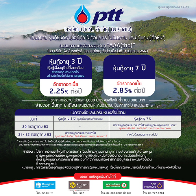 สิ้นสุดการรอคอยสำหรับผู้ลงทุนประชาชนทั่วไป ที่เฝ้ารอลงทุนหุ้นกู้ของบริษัทพลังงานยักษ์ใหญ่ บริษัท ปตท. จำกัด (มหาชน) อันดับเรทติ้งสูงสุดของตราสารหนี้ในประเทศไทยที่ AAA(tha) จัดอันดับโดย ฟิทช์ เรทติ้งส์ (ประเทศไทย) มีให้เลือก 2 รุ่น หุ้นกู้อายุ 3 ปี (กรีนบอนด์) อัตราดอกเบี้ย 2.25% ต่อปี และหุ้นกู้อายุ 7 ปี อัตราดอกเบี้ย 2.85% ต่อปี จ่ายดอกเบี้ยทุก 6 เดือน แต่รุ่น 7 ปีจะให้สิทธิผู้ถือหุ้นกู้เดิมของ ปตท. (8 รุ่น ที่ครบกำหนดไถ่ถอนไปแล้วระหว่างปี 2559 ถึง 2562) ได้ใช้สิทธิ์จองซื้อก่อนในวันที่ 20 กรกฎาคม