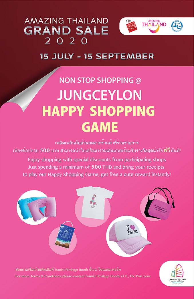 โดย นภสร ค้าขาย ผู้อำนวยการสำนักงาน การท่องเที่ยวแห่งประเทศไทย (ททท.) สำนักงานภูเก็ต พร้อม ประวิช จรรยาสิทธิกุล ประธานเจ้าหน้าที่บริหารศูนย์การค้าจังซีลอน ป่าตอง ภูเก็ต และ แจ็คกี้ เธีย ผู้จัดการทั่วไปศูนย์การค้าจังซีลอน ป่าตอง ภูเก็ต จับมือร่วมสนับสนุนโครงการ Amazing Thailand Grand Sale 2020 (ATGS 2020) มหกรรมลดกระหน่ำครั้งใหญ่ประจำปี โดยศูนย์การค้าจังซีลอน ร่วมกับร้านค้าภายในศูนย์การค้าฯ มอบสิทธิพิเศษและส่วนลดมากมายให้กับนักท่องเที่ยวที่เดินทางมายังจังหวัดภูเก็ต พร้อมส่งโปรโมชั่น “Non Stop Shopping @Jungceylon Happy Shopping Game” เมื่อช้อปสินค้าจากร้านค้าภายในศูนย์การค้าฯ ครบทุก 500 บาท สามารถนำใบเสร็จมาร่วมเล่นเกมได้ที่ Tourist Privilege Booth ลานเดอะพอร์ท อารีน่า เพื่อลุ้นรับของรางวัลพรีเมี่ยมสุดพิเศษมากมาย อาทิ เสื้อยืด, กระเป๋า, หมวก, หมอนรองคอ ฯลฯ