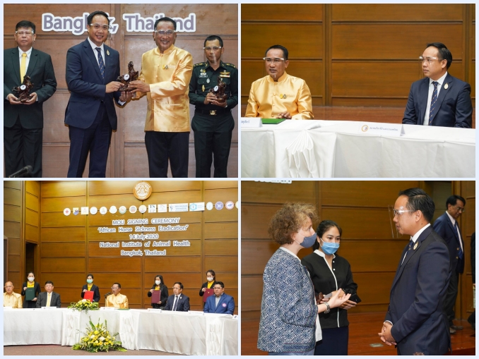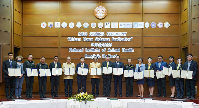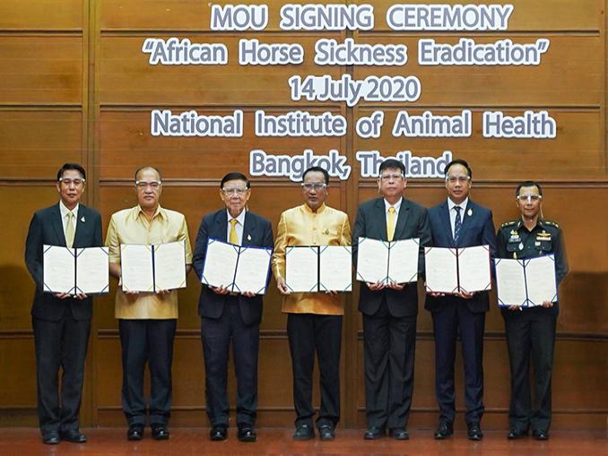 สำหรับหน่วยงานที่ร่วมลงนามบันทึกความร่วมมือ (MOU) การกำจัดโรคกาฬโรคแอฟริกาในม้า (African Horse Sickness) ของประเทศไทย 17 หน่วยงาน ประกอบด้วย 1. กรมปศุสัตว์ 2. กรมอุทยานแห่งชาติสัตว์ป่าและพันธุ์พืช 3.กรมส่งเสริมการปกครองท้องถิ่น 4.กรมประชาสัมพันธ์ 5. สัตวแพทยสภา 6. สมาคมสัตวแพทย์สวนสัตว์และสัตว์ป่า 7. ภาคีคณบดีคณะสัตวแพทยศาสตร์แห่งประเทศไทย 8. องค์การสวนสัตว์ในพระบรมราชูปถัมภ์ 9. สถานเสาวภา สภากาชาดไทย 10. สมาคมกีฬาขี่ม้าแห่งประเทศไทย 11. สมาคมกีฬาม้าแข่งไทย 12. สมาคมกีฬาขี่ม้าโปโลแห่งประเทศไทย 13. กรมการสัตว์ทหารบก 14. หน่วยม้าทรงประจำพระองค์ฯ 15. กองพันทหารม้าที่ 29 รักษาพระองค์กองบังคับการสายตรวจและปฏิบัติการพิเศษ 16. ชมรมสัตวแพทย์บำบัดโรคม้าและ 17. มูลนิธิม้าไทย