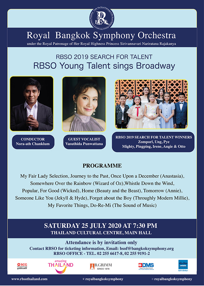 มูลนิธิรอยัลแบงค์คอกซิมโฟนีออร์เคสตร้า ในพระอุปถัมภ์สมเด็จพระเจ้าลูกเธอ เจ้าฟ้าสิริวัณณวรีนารีรัตนราชกัญญา โดยความสนับสนุนของ การท่องเที่ยวแห่งประเทศไทย โดยความสนับสนุนของ บี.กริม, BDMS, เมืองไทยประกันภัย และ มูลนิธิเอสซีจี จัดการแสดงคอนเสิร์ต รายการ “RBSO Young Talent Sings Broadway” เชิญเยาวชนไทย 8 คนที่มากด้วยพรสวรรคความสามารถพิเศษด้านการร้องเพลง และชนะการแข่งขันร้องเพลงโครงการ RBSO Search for Talent