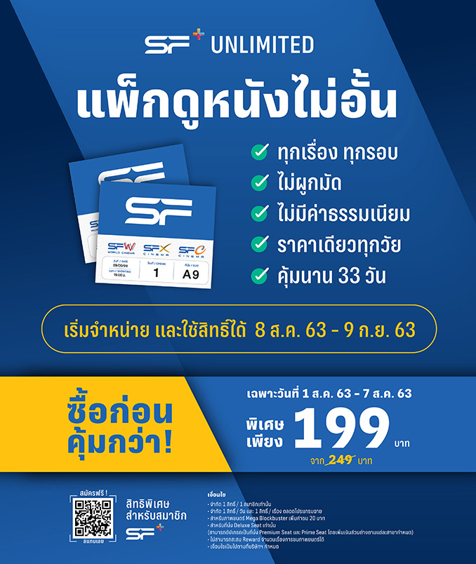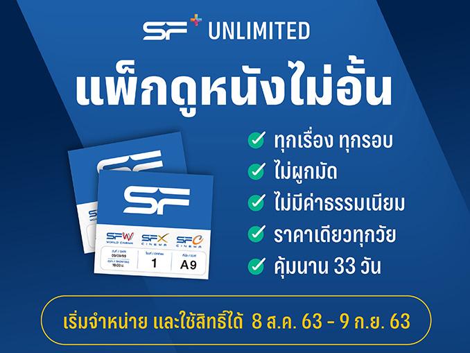 โรงภาพยนตร์ในเครือ เอส เอฟ อยากให้ทุกคนกลับมามีความสุขในการชมภาพยนตร์ จัดโปรแรง “SF+ UNLIMITED (เอส เอฟ พลัส อันลิมิเต็ด)” แพ็กเกจสุดคุ้ม รับสิทธิ์ดูหนังไม่จำกัดระหว่างวันที่ 8 สิงหาคม – 9 กันยายน 2563 (จำกัด 1 สิทธิ์/วัน/เรื่องตลอดโปรแกรมฉาย) ในราคา 249 บาท พิเศษสุดสำหรับลูกค้าที่สมัครแพ็กเกจล่วงหน้าภายในวันที่ 1-7 สิงหาคม 2563 สามารถซื้อได้ในราคาเพียง 199 บาทเท่านั้น!
