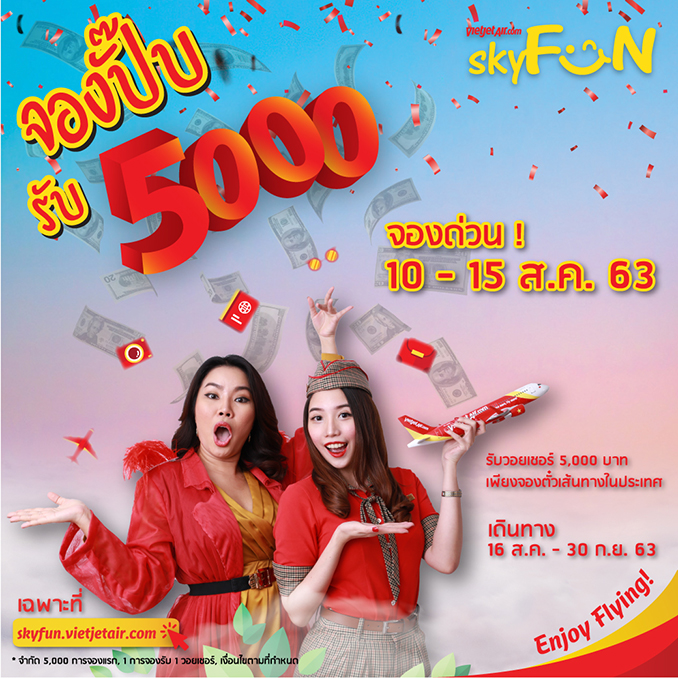 เพื่อเป็นการเฉลิมฉลองเนื่องในโอกาสวันแม่ สายการบินไทยเวียตเจ็ทประกาศเปิดตัวแคมเปญใหญ่“ Surprised Voucher” บนเว็บไซต์จองตั๋วเครื่องบินช่องทางใหม่ที่ Skyfun.vietjetair.com แจก “Surprised Voucher” บัตรกำนัลมูลค่า 5,000 บาทต่อการจอง สำหรับทุกๆการจองตั๋วเครื่องบินไทยเวียตเจ็ทในระหว่างวันที่ 10-15 สิงหาคม 2563 สำหรับการเดินทางตั้งแต่วันที่ 16 สิงหาคม - 30 กันยายน 2563 เมื่อทำการจองตั๋วและชำระเงินผ่านเว็บไซต์ Skyfun.vietjetair.com เท่านั้น โดยบัตรกำนัล “ Surprised Voucher” มูลค่า 5,000 บาท จะทำการแจกทั้งหมด 5,000 ใบ มูลค่ารวมถึง 25,000,000 บาท แจกให้ผู้ที่ทำการจองตั๋วตามลำดับการจองจนกว่าบัตรกำนัลจะหมด หรือจนครบระยะเวลาการแจกบัตรกำนัลที่กำหนดไว้