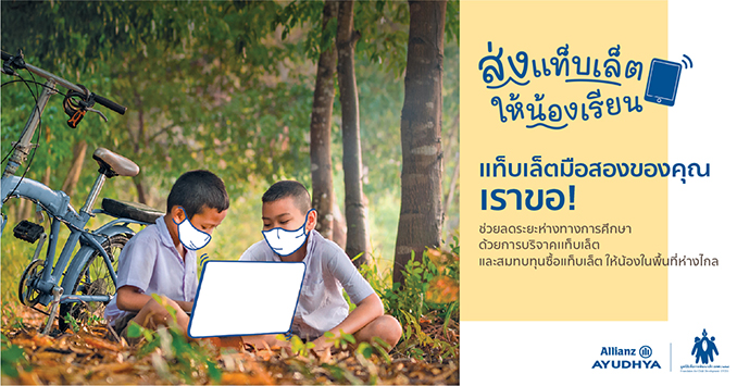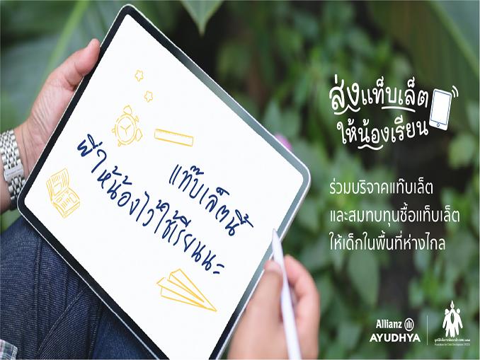 อลิอันซ์ อยุธยา ประกันชีวิต เดินหน้าจัดกิจกรรมเพื่อสังคมภายใต้แนวคิด“ปันความรู้สู่เด็กไทย” ต่อเนื่องโดยร่วมกับมูลนิธิเพื่อการพัฒนาเด็ก จัดโครงการส่งแท็บเล็ตให้น้องเรียน ระดมอุปกรณ์สื่อสารอิเล็กทรอนิกส์มือสองให้แก่โรงเรียนและเยาวชนในพื้นที่ห่างไกลเพื่อมอบโอกาสและความเท่าเทียมในการเข้าถึงการศึกษาของเด็กไทยในยุคโควิด 19 โดยอลิอันซ์ อยุธยา ทั้งนี้ผู้สนใจสามารถร่วมสมทบทุนหรือร่วมบริจาคอุปกรณ์สื่อสารอิเล็กทรอนิกส์ผ่านจุดรับบริจาคแบบ Park & Drop ณ สำนักงานใหญ่ อลิอันซ์ อยุธยา ประกันชีวิต อาคารเพลินจิตทาวเวอร์ ในวันที่ 20 สิงหาคม 2563 หรือ ณ ศูนย์บริการ อลิอันซ์ อยุธยา 27 แห่ง ทั้งประกันชีวิต และประกันวินาศภัย ทั่วประเทศ ตั้งแต่วันที่ 13- 31 สิงหาคม 2563