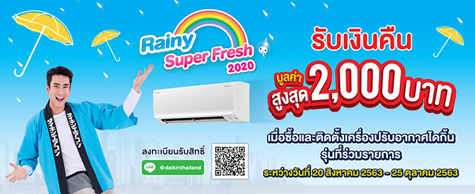 สามารถดูรายละเอียดโปรโมชั่น Rainy Super Fresh 2020 เพิ่มเติมได้ที่เว็บไซต์ไดกิ้น https://www.daikin.co.th/promotions/daikin-rainy-super-fresh-2020/ เฉพาะตัวแทนจำหน่ายประเภท Dealer ที่ร่วมรายการ โปรดตรวจสอบเพิ่มเติม ณ จุดขาย สามารถตรวจสอบตัวแทนจำหน่ายประเภท Dealer ได้จาก https://www.daikin.co.th/wheretobuy/ หรือสอบถามรายละเอียดเพิ่มเติมได้ที่ ไดกิ้น คูล ไลน์ (Daikin Cool Line) 1271