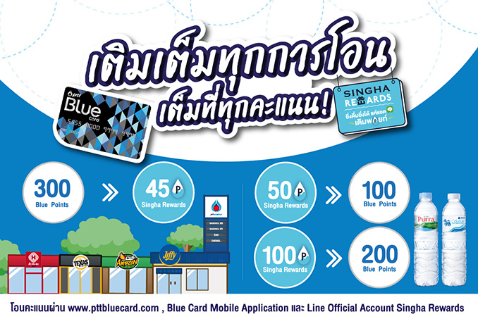 ทั้งนี้ สมาชิก Singha Rewards สามารถนำพอยท์ โอนเป็นคะแนนสะสมบลูพอยท์ ได้แล้วโดยกรอกหมายเลขบัตรสมาชิก Blue Card ผ่านทาง Line Official Account Singha Rewards และสามารถนำคะแนนสะสม บลูพอยท์แลกเป็นพอยท์ สิงห์ รีวอร์ด ได้ผ่านทาง www.pttbluecard.com หรือ Blue Card Mobile Application ตั้งแต่วันนี้ ถึง 31 กรกฎาคม 2564 หรือสามารถติดตามรายละเอียดเพิ่มเติมได้ที่ Line@SinghaRewards และ Facebook Singha Drinking Water