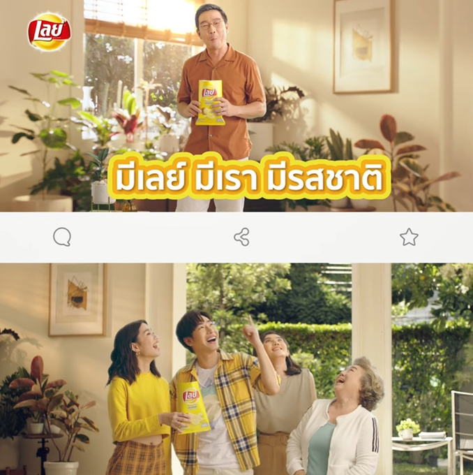 และในครั้งนี้ เลย์ได้มีการผสมผสานสื่อบนหนังโฆษณาและสื่อดิจิทัลร่วมด้วยกัน โดยเนื้อหาหลักของแคมเปญ Flavor of Togetherness อยู่บนหนังโฆษณา นำเสนอถึงช่วงเวลาสนุกสนานของสมาชิกในครอบครัวทั้ง 5 คน ได้แก่ ลูกชาย(เป๊ก-ผลิตโชค) ลูกสาว พ่อ แม่ และย่า ที่เชื่อมโยงกันและถูกนำไปปรับเป็นคลิปสั้นต่างๆ แยกย่อยบนสื่อดิจิทัลเพื่อสื่อสารไปยังกลุ่มเป้าหมายที่แตกต่างกันทั้งหมด 3 กลุ่มเป้าหมาย ได้แก่ กลุ่มครอบครัว นำเสนอเรื่องราวความสนุกของสมาชิกในบ้าน, กลุ่มวัยรุ่น นำเสนอโมเมนต์ความน่ารักระหว่างลูกชาย(เป๊ก-ผลิตโชค) และลูกสาว, และกลุ่มแม่บ้าน นำเสนอในแง่ของการซื้อเลย์เก็บไว้ที่บ้านหรือสั่งซื้อเลย์ผ่านช่องทางออนไลน์ให้แก่สมาชิกครอบครัว รวมทั้งมีการออกแบบคลิปให้เหมาะสมกับแพลตฟอร์มหรือพฤติกรรมการใช้งานบนโซเชียลมีเดีย เช่น การแบ่งเฟรมบนล่างตามลักษณะของโซเชียลมีเดีย และ Meme หรือภาพขำขันที่เป็นสีหน้าของตัวละครในหนังโฆษณา ยิ่งก่อให้เกิดการจดจำและกลายเป็นกระแสที่ถูกแชร์บนโลกออนไลน์ในช่วงที่ผ่านมา