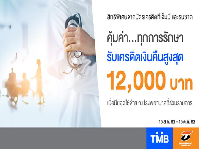 บัตรเครดิตทีเอ็มบีและบัตรเครดิตธนชาต รับความคุ้มค่าทุกการรักษา เพื่อสร้างชีวิตทางการเงินที่ดีขึ้นให้กับลูกค้า โดยมอบเครดิตเงินคืนสูงสุด 12,000 บาท ตั้งแต่วันนี้ – 15 ตุลาคม 2563 เพียงมียอดใช้จ่ายค่ารักษาพยาบาลกับโรงพยาบาลชั้นนำที่ร่วมรายการ ได้แก่ โรงพยาบาลกรุงเทพ โรงพยาบาลพญาไท โรงพยาบาลเปาโล โรงพยาบาลสมิติเวช โรงพยาบาลพระรามเก้า โรงพยาบาลบางปะกอก 9โรงพยาบาล นนทเวช โรงพยาบาลไทยนครินทร์ โรงพยาบาลวิภาวดี โรงพยาบาลวิชัยยุทธ โรงพยาบาลนครธน โรงพยาบาลเวชธานี โรงพยาบาลจุฬารัตน์ โรงพยาบาลสินแพทย์และในเครือ โรงพยาบาลเกษมราษฎร์และในเครือ เมื่อมียอดใช้จ่าย 10,000 – 29,999 บาท/เซลล์สลิป รับเครดิตเงินคืน 200 บาท/สิทธิ์, ยอดใช้จ่าย 30,000 – 59,999 บาท/เซลล์สลิป รับเครดิตเงินคืน 700 บาท/สิทธิ์, ยอดใช้จ่าย 60,000 – 99,999 บาท/เซลล์สลิป รับเครดิตเงินคืน 1,500 บาท/สิทธิ์, ยอดใช้จ่าย 100,000 – 199,999 บาท/เซลล์สลิป รับเครดิตเงินคืน 2,800 บาท/สิทธิ์ และยอดใช้จ่าย 200,000 บาท ขึ้นไป/เซลล์สลิป รับเครดิตเงินคืน 6,000 บาท/สิทธิ์