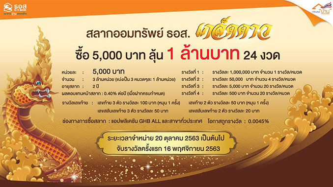 ทั้งนี้ สลากออมทรัพย์ ธอส. ชุดเกล็ดดาว จำหน่ายรวม 3 ล้านหน่วย กรอบวงเงิน 15,000 ล้านบาท แบ่งออกเป็น 3 หมวดๆ ละ 1 ล้านหน่วย อายุสลาก 2 ปี ผลตอบแทนหน้าสลาก 0.4% ต่อปี ออกรางวัลทุกเดือน รวม 24 ครั้ง แบ่งเป็น รางวัลที่ 1 มูลค่ารางวัลสูงถึง 1,000,000 บาท/หมวด รางวัลที่ 2 มูลค่า รางวัลละ 50,000 บาท จำนวน 4 รางวัล/หมวด รางวัลที่ 3 มูลค่ารางวัลละ 5,000 บาท จำนวน 20 รางวัล/หมวด รางวัลที่ 4 มูลค่ารางวัลละ 500 บาท จำนวน 20 รางวัล/หมวด รางวัลเลขท้าย 3 ตัว รางวัลละ 100 บาท รางวัลเลขสลับเลขท้าย 3 ตัว รางวัลละ 50 บาท รางวัลเลขท้าย 2 ตัว รางวัลละ 50 บาท และรางวัลเลขสลับเลขท้าย 2 ตัว รางวัลละ 20 บาท เริ่มออกรางวัลครั้งแรกวันที่ 16 พฤศจิกายน 2563