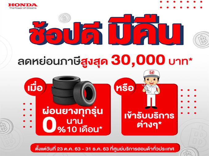 บริษัท ฮอนด้า ออโตโมบิล (ประเทศไทย) ชวนลูกค้าซื้อสินค้าและเข้ารับการบริการ* ณ โชว์รูมและศูนย์บริการฮอนด้าทั่วประเทศ ภายใต้โครงการ “ช้อปดีมีคืน” ตั้งแต่วันที่ 23 ตุลาคม – 31 ธันวาคม 2563 ซึ่งเป็นมาตรการช่วยกระตุ้นเศรษฐกิจของประเทศไทยในช่วงปลายปีโดยกระทรวงการคลัง โดยลูกค้าสามารถนำใบเสร็จรับเงินหรือใบกำกับภาษีแบบเต็มรูปแบบจากยอดค่าใช้จ่ายจริง สูงสุด 30,000 บาท มาลดหย่อนภาษีเงินได้บุคคลธรรมดาประจำปีภาษี 2563
