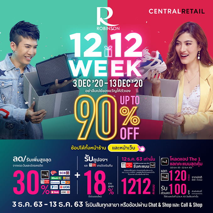 สายช้อปห้างฯ และออนไลน์ ไม่ควรพลาด! มาร่วมเปย์ของขวัญให้ตัวเองในเดือนแห่งความสุข ทั้งหน้าร้าน และหน้าเว็บ ในแคมเปญ ‘ROBINSON 12.12 WEEK’ ตั้งแต่วันที่ 3 – 13 ธันวาคม 2563 ที่ห้างสรรพสินค้าโรบินสัน (ยกเว้นสาขาซีลอน ป่าตอง), Robinson Call & Shop, Robinson Chat & Shop, Robinson Facebook Inbox และ Robinson Drive Thru และหน้าเว็บ ที่ Robinson Online คลิก https://www.robinson.co.th/th/campaign/12-12