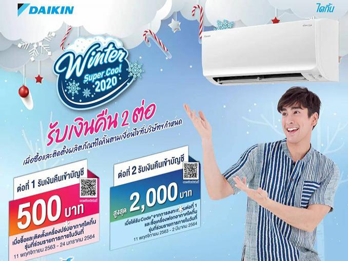 ต่อที่ 1 เมื่อซื้อและติดตั้งเครื่องปรับอากาศไดกิ้นสำเร็จในระหว่างวันที่ 11 พฤศจิกายน 2563 - 24 มกราคม 2564 เฉพาะรุ่นที่ร่วมรายการ ได้แก่ รุ่น FTKM33NV2S, FTKM-S, FTKC-T, FTKF-U, FTKQ-U, FTM-P จะได้รับเงินคืนเข้าบัญชีธนาคารจำนวน 500 บาท โดยสามารถเข้าไปลงทะเบียนรับสิทธิ์ที่หน้าเว็บไซต์ https://www.daikin.co.th/winter-super-cool-2020-registration โดยผู้ขอรับเงินคืนสามารถได้รับเงินคืนสูงสุดไม่เกิน 3 เครื่อง เมื่อรวมทุกใบเสร็จรับเงิน