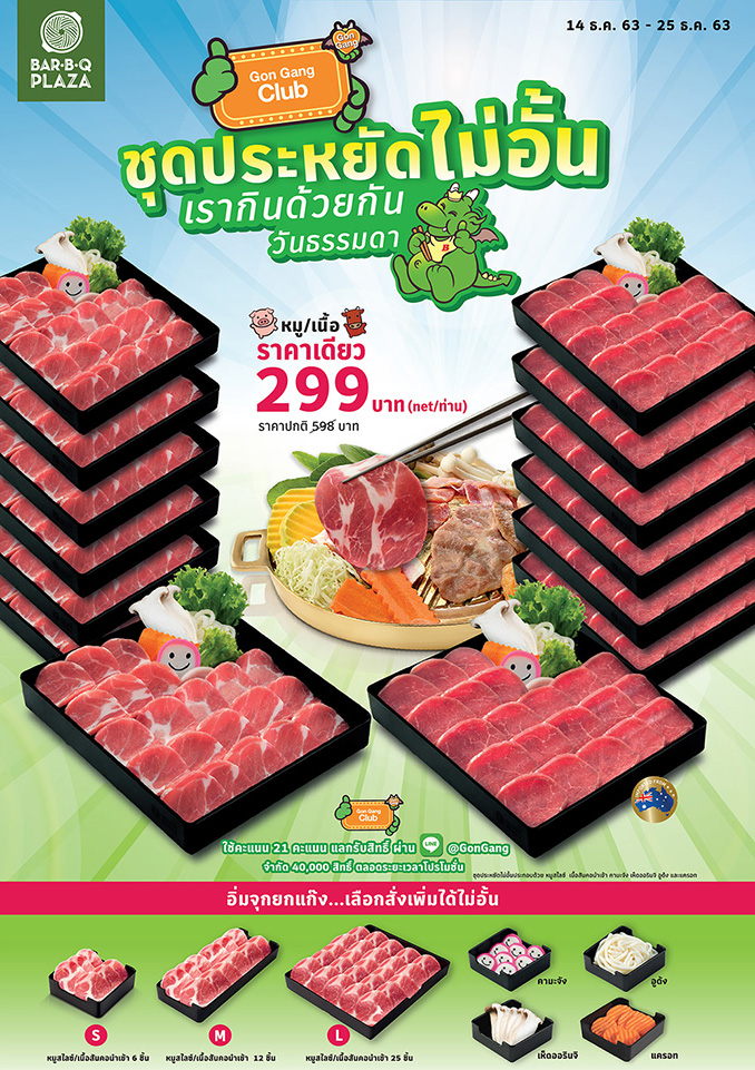 ร่วมสัมผัสประสบการ์ณสุดเอ็กซ์คลูซีฟแบบอิ่มไม่อั้นส่งท้ายปี ไปกับ Gon Gang Club และบาร์บีคิวพลาซ่า ได้ก่อนใคร! สำหรับสมาชิกเพียงใช้ 21 คะแนน แลกรับสิทธิ์ผ่าน LINE Gon Gang (1 สมาชิก/1 สิทธิ์ ไม่จำกัดผู้ติดตาม) 1 สิทธิ์สามารถนำ E- Coupon สั่งชุดประหยัดหมูและเนื้อเติมได้ไม่อั้น ในราคา 299 บาทเท่านั้น! ที่ร้านบาร์บีคิวพลาซ่า ทุกสาขา (ยกเว้น 11 สาขาไม่เข้าร่วม) และพิเศษขึ้นไปอีกสำหรับเด็กอายุต่ำกว่า 12 ปี ที่มีส่วนสูง 110 - 130 เซนติเมตร รับสิทธิ์ทานครึ่งราคา เมื่อแสดงบัตรประชาชน และเด็กที่มีส่วนสูงไม่เกิน 109 เซนติเมตร รับสิทธิ์ทานฟรี! ในวันจันทร์ ถึง วันศุกร์ ระหว่างวันที่ 14 –18 และ 21– 25 ธันวาคม 2563