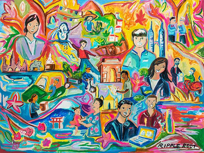 ริพเพิล รูท ศิลปินดาวรุ่งที่เปี่ยมด้วยพรสวรรค์ ผู้ซึ่งมีผลงานที่ได้รับการกล่าวถึงในการประมูลออนไลน์ของซัทเทบีส์ (Sotheby's)บริษัทจัดการประมูลผลงานศิลปะ ที่ ได้รับการคัดเลือกจากแมริออท อินเตอร์เนชั่นแนล เพื่อสร้างแรงบันดาลใจให้กับผู้คนทั่วภูมิภาคเอเชีย แปซิฟิก ด้วยผลงานที่แสดงให้เห็นถึงความมหัศจรรย์ของการเดินทางและตั้งตารอคอยปีใหม่ที่จะมาถึง ในขณะที่เราเริ่มฟื้นตัวจากปีแห่งความท้าทายนี้ สำหรับ ริพเพิล รูท มีความโดดเด่นทางด้านการใช้สีที่จัดจ้าน ฝีแปรงที่มีจังหวะ และรูปแบบที่สนุกสนาน ปรากฏเป็นผลงานที่เต็มไปด้วยอิสระ เปี่ยมด้วยพลังของเยาวชน คนรุ่นใหม่ และความไร้เดียงสา