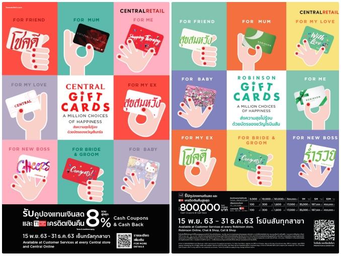 ห้างเซ็นทรัล และโรบินสัน ร่วมเป็นส่วนหนึ่งในการสร้างโมเม้นต์ดีๆให้แก่กัน ในช่วงเทศกาลแห่งการให้ เพื่อส่งมอบความสุขอย่างไม่รู้จบผ่านบัตรของขวัญ “CENTRAL & ROBINSON GIFT CARDS” ลวดลายใหม่ ในคอนเซ็ปต์ A Million Choices of Happiness ส่งความสุขไม่รู้จบ แด่ลูกค้าที่รักการช้อปปิ้ง ทั้งยังสามารถมอบให้แก่กันได้ในทุกโอกาสพิเศษตลอดทั้งปี โดยมีให้เลือกหลากหลายแบบตอบโจทย์ลูกค้าครบทุกครันทุกไลฟ์สไตล์ นอกจากนี้ ยังเพิ่มความพิเศษขึ้นอีกขั้น!!! เพราะทุกการ ช้อปบัตรของขวัญ CENTRAL & ROBINSON GIFT CARDS สามารถรับคูปองแทนเงินสด และเครดิตเงินคืนรวมสูงสุด 8% (รวมมูลค่าสูงสุด 800,000 บาท) เมื่อช้อปตามเงื่อนไข ตั้งแต่วันที่ 15 พ.ย. – 31 ธ.ค. 63